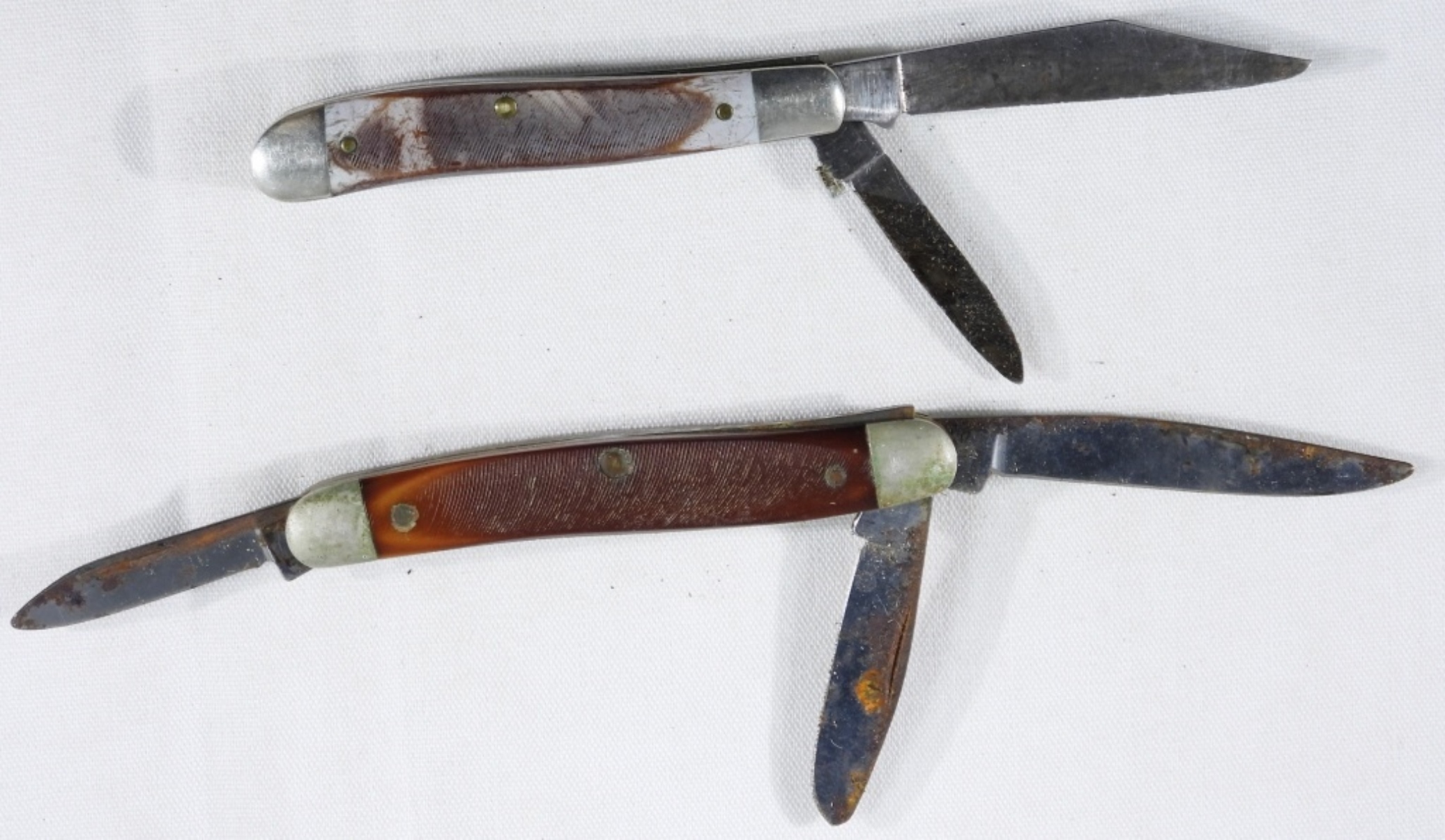 1) Three-blade pocket knife. 2) Two-blade pocket knife