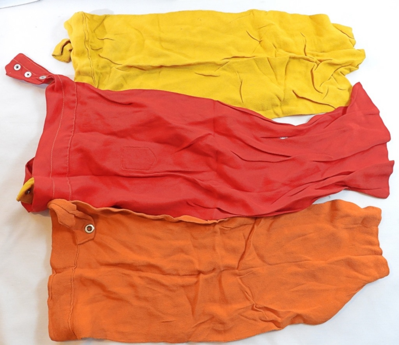 a yellow, red, and an orange flash hood-bib, all snaps present and functional, the red has U.S. Army Engineers badge