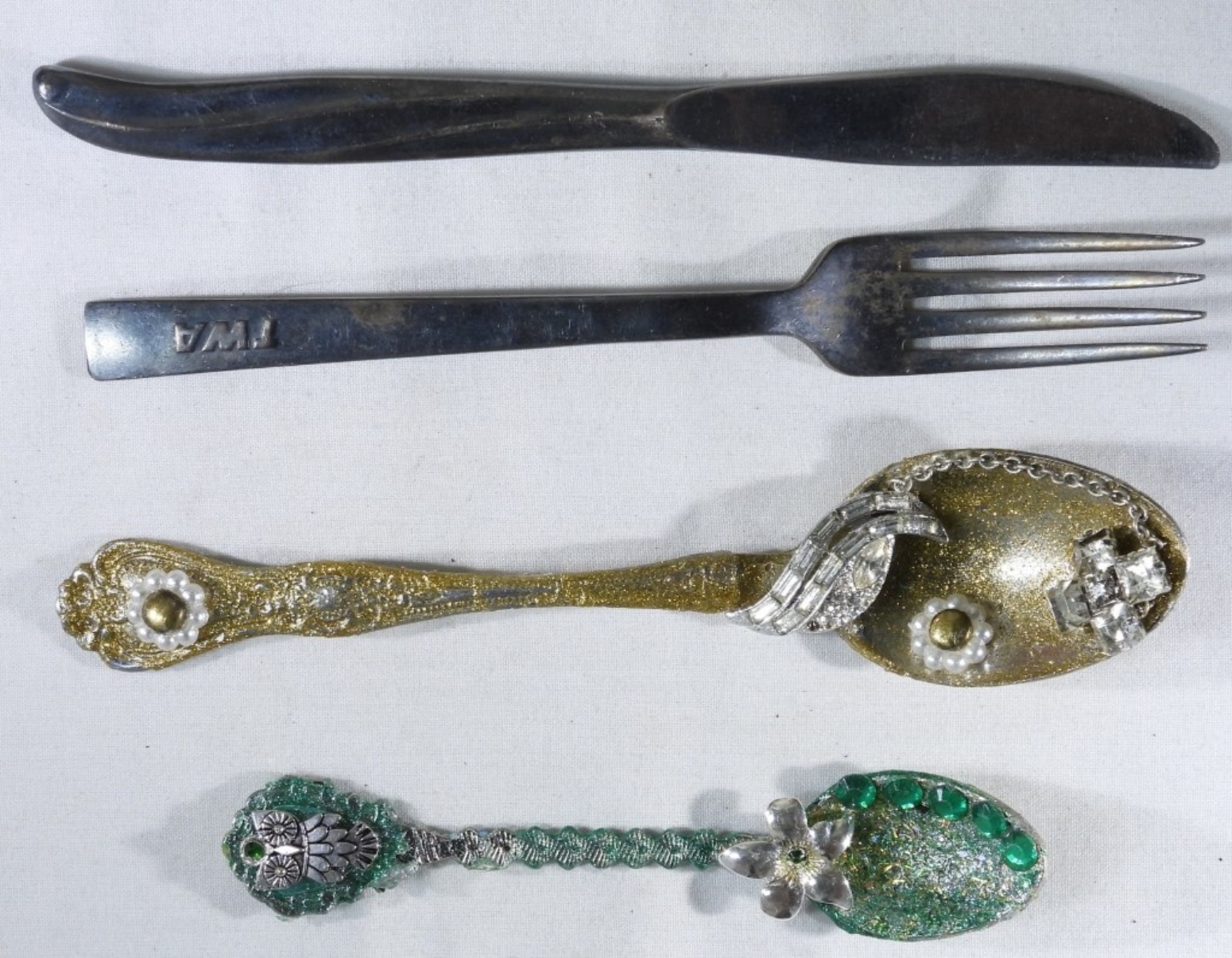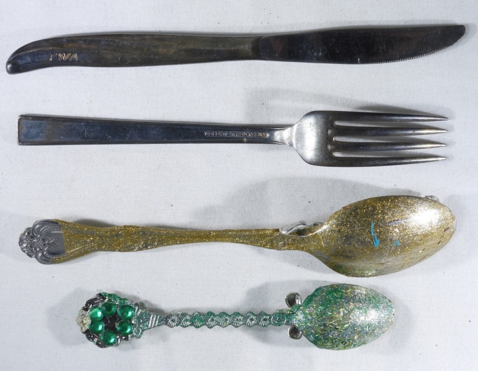 2 spoons are decorated but the fork and knife are not