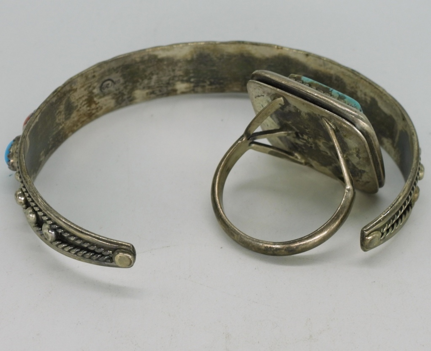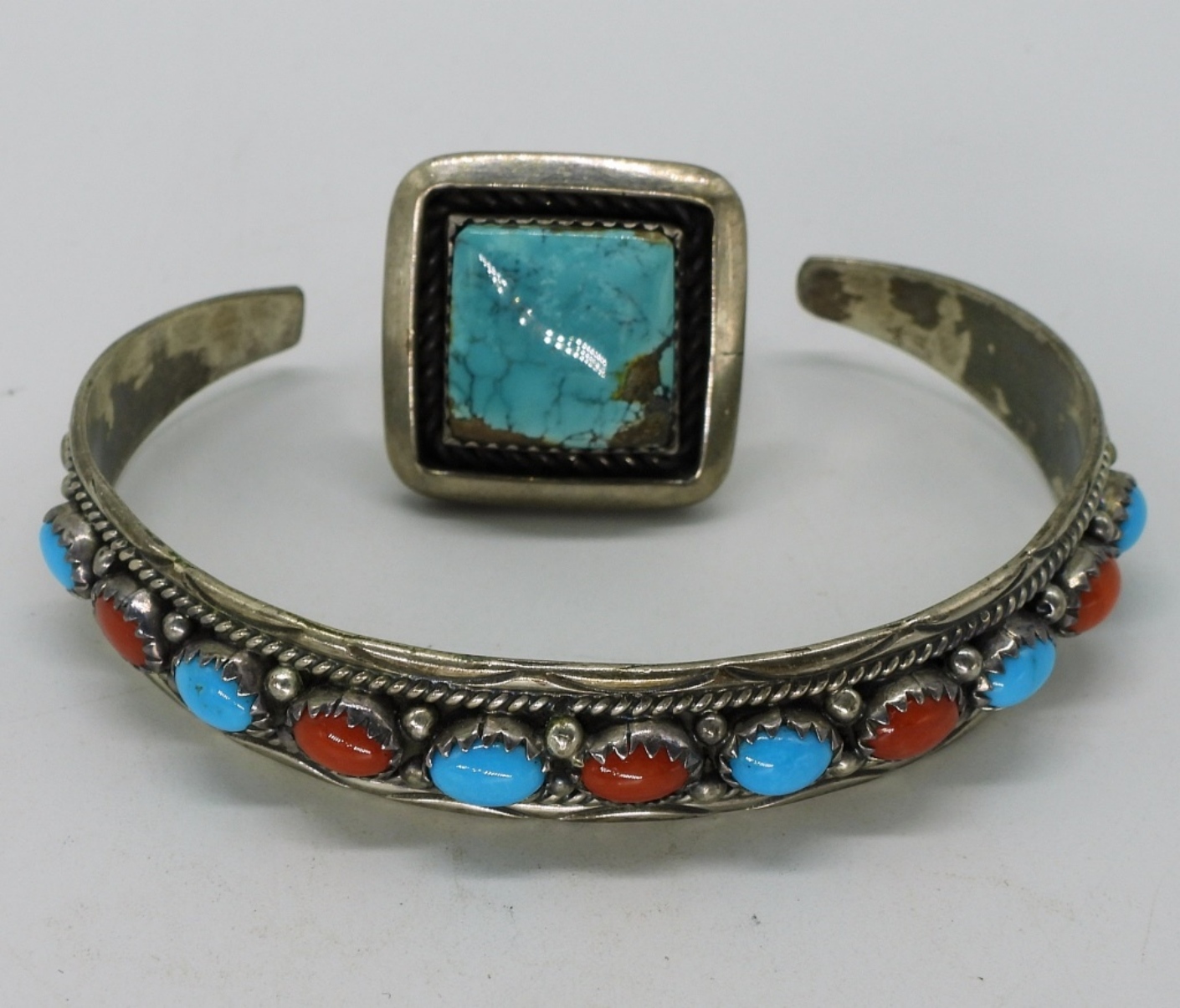 Sterlin cuff bracelet with blue turquoise & coral gemstones. Gorgeous turquoise sterling ring, size 9. (16.9 dwt) (6x4x2)