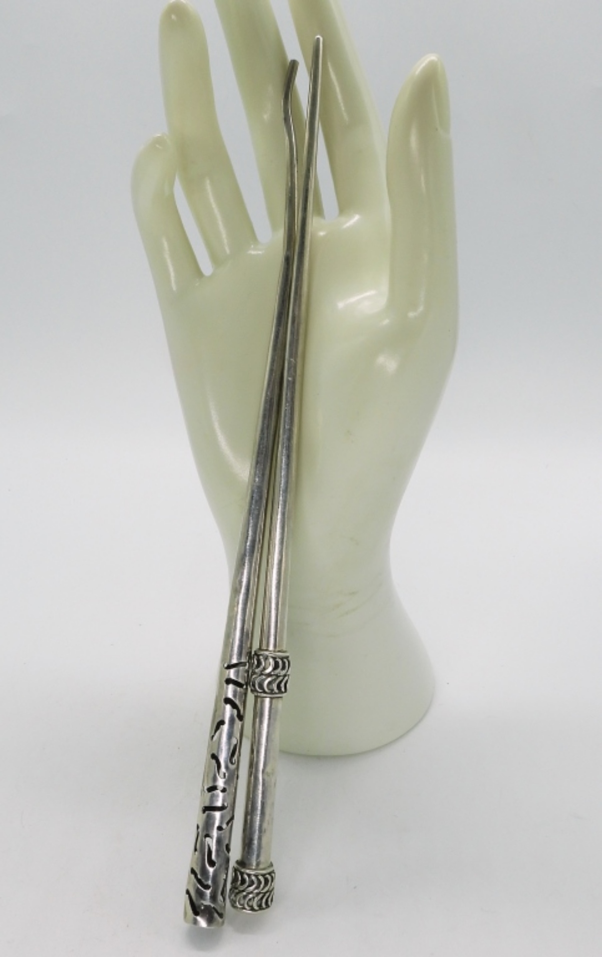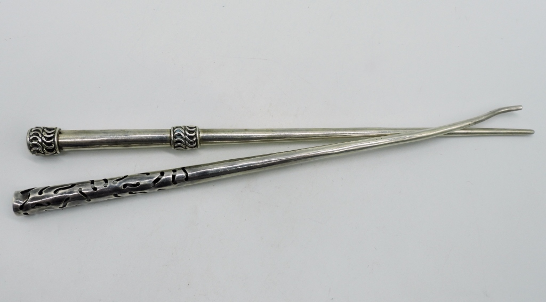 Two mismatched sterling hair sticks. 8″ long, one is bent at the tip. (19.7 dwt) (6x4x2)