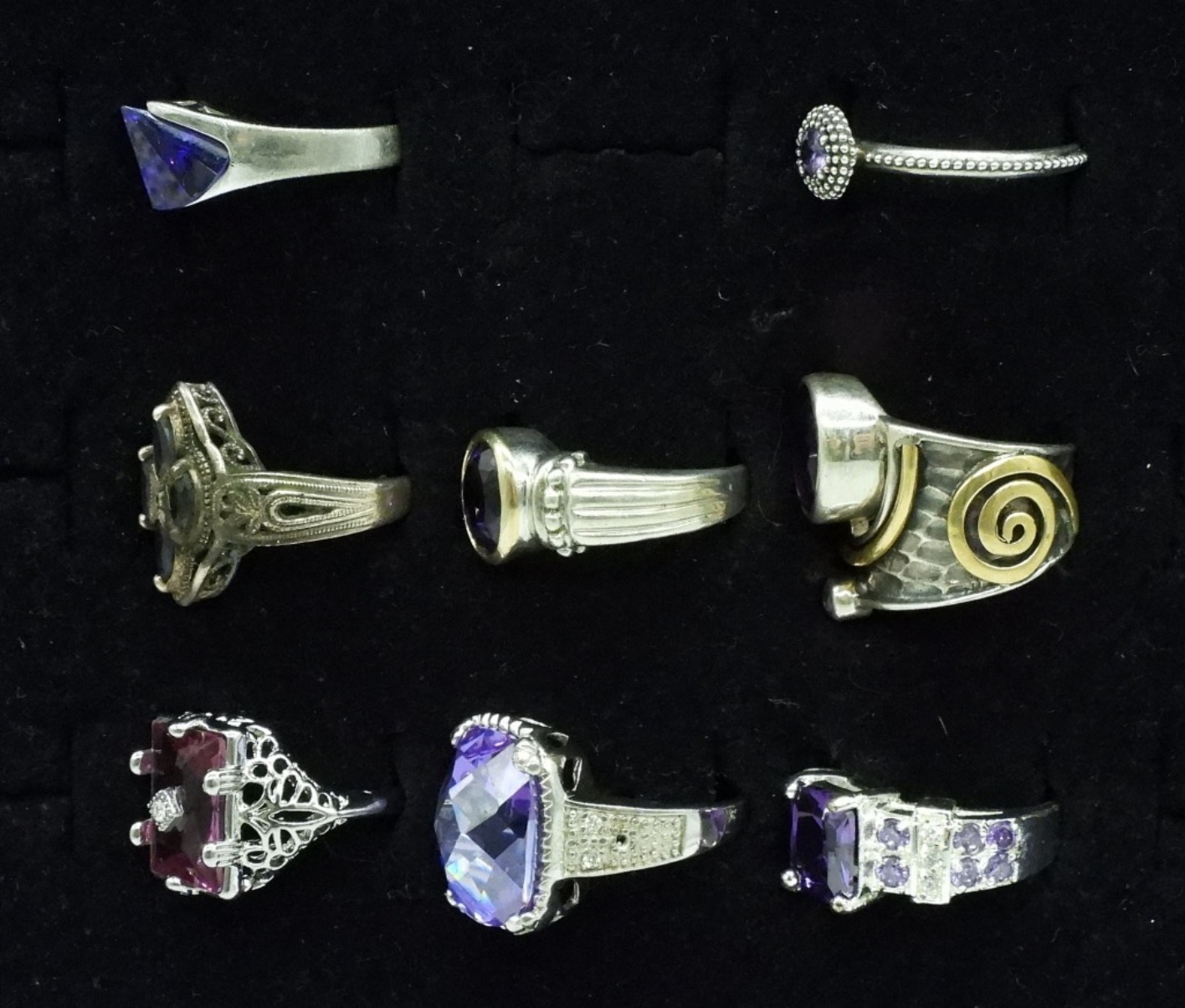 Eight gorgeous sterling rings with amethyst gemstones. Sizes 7, 8, 9. (28 dwt) (6x4x2)