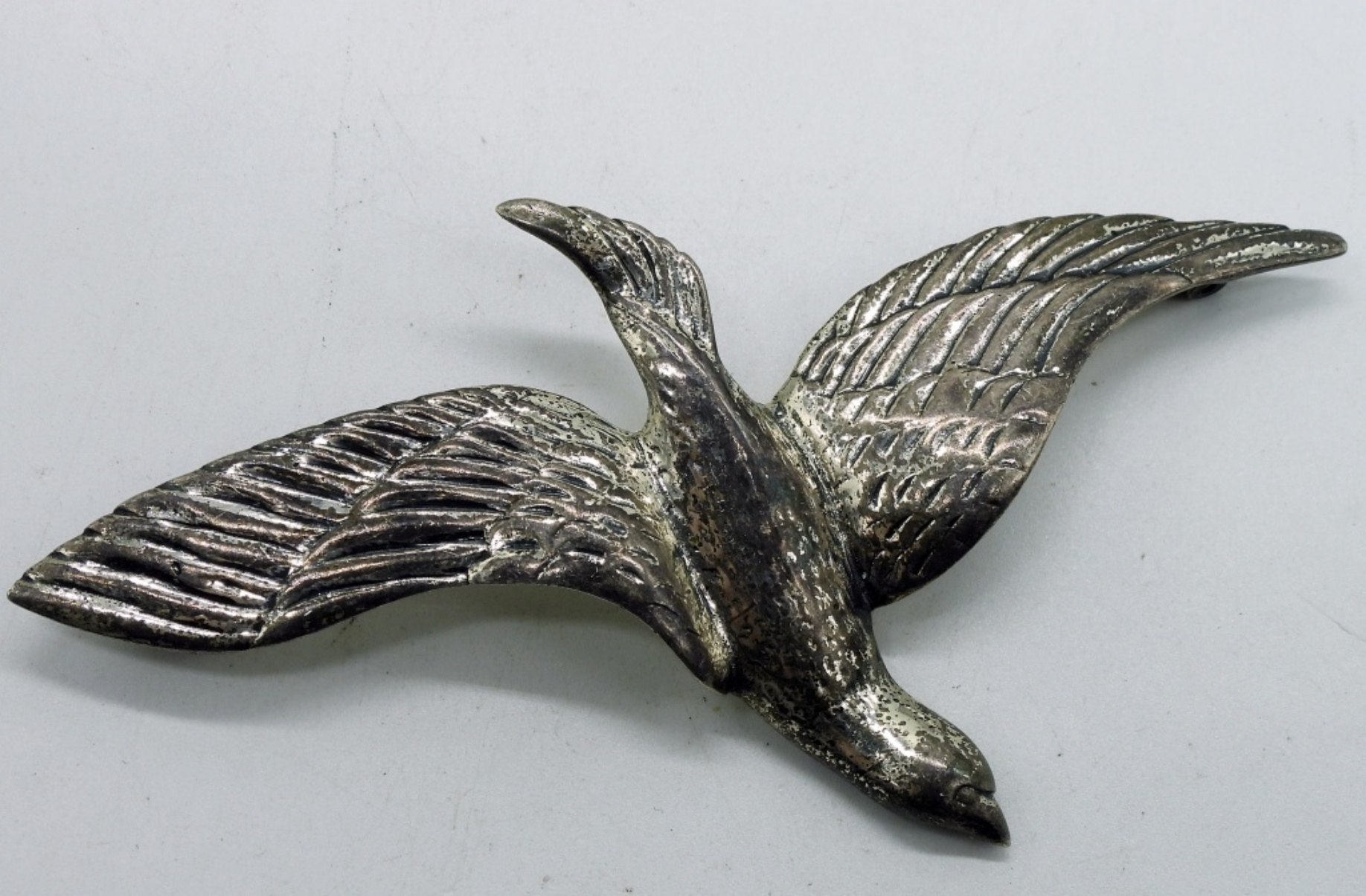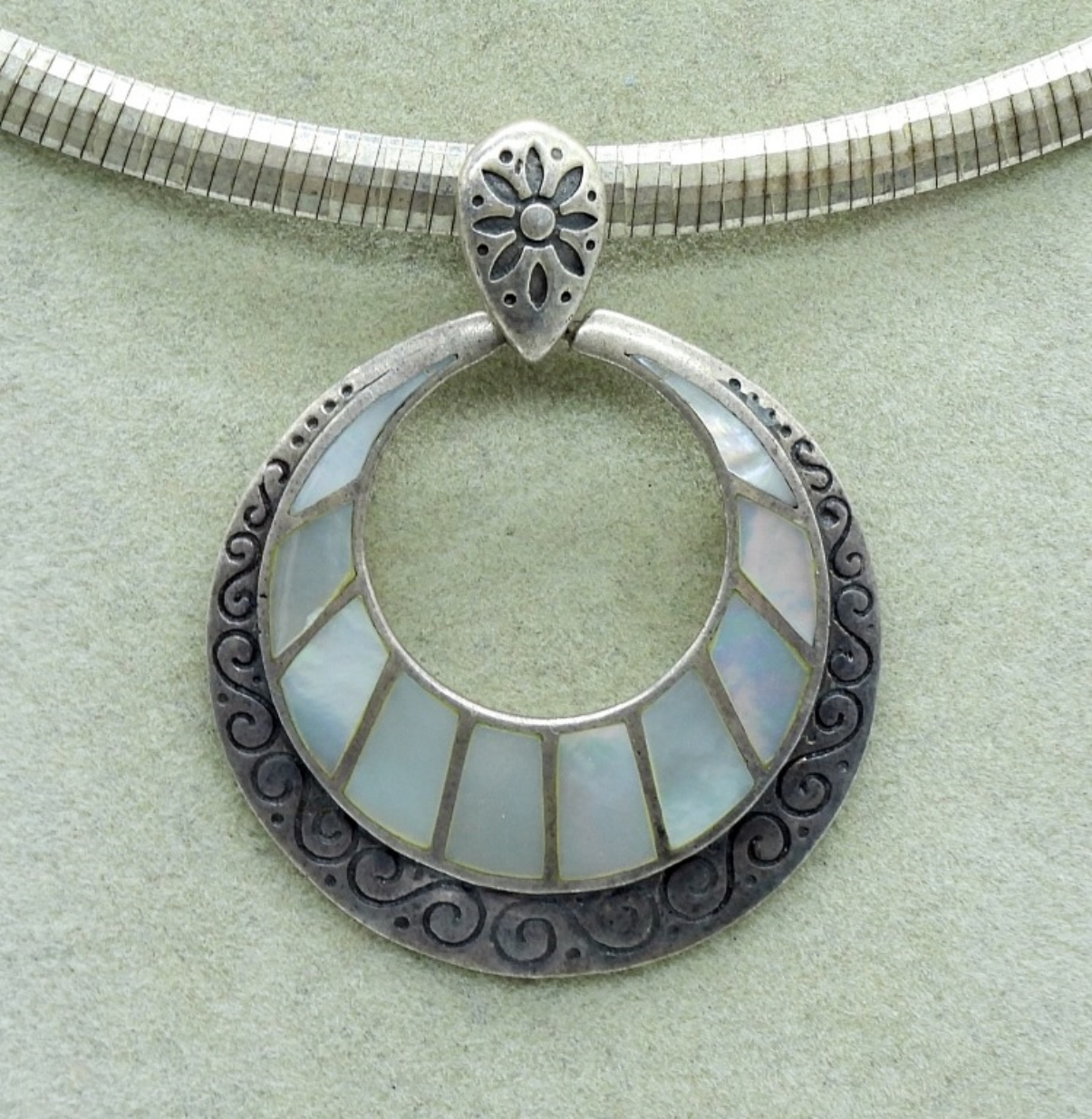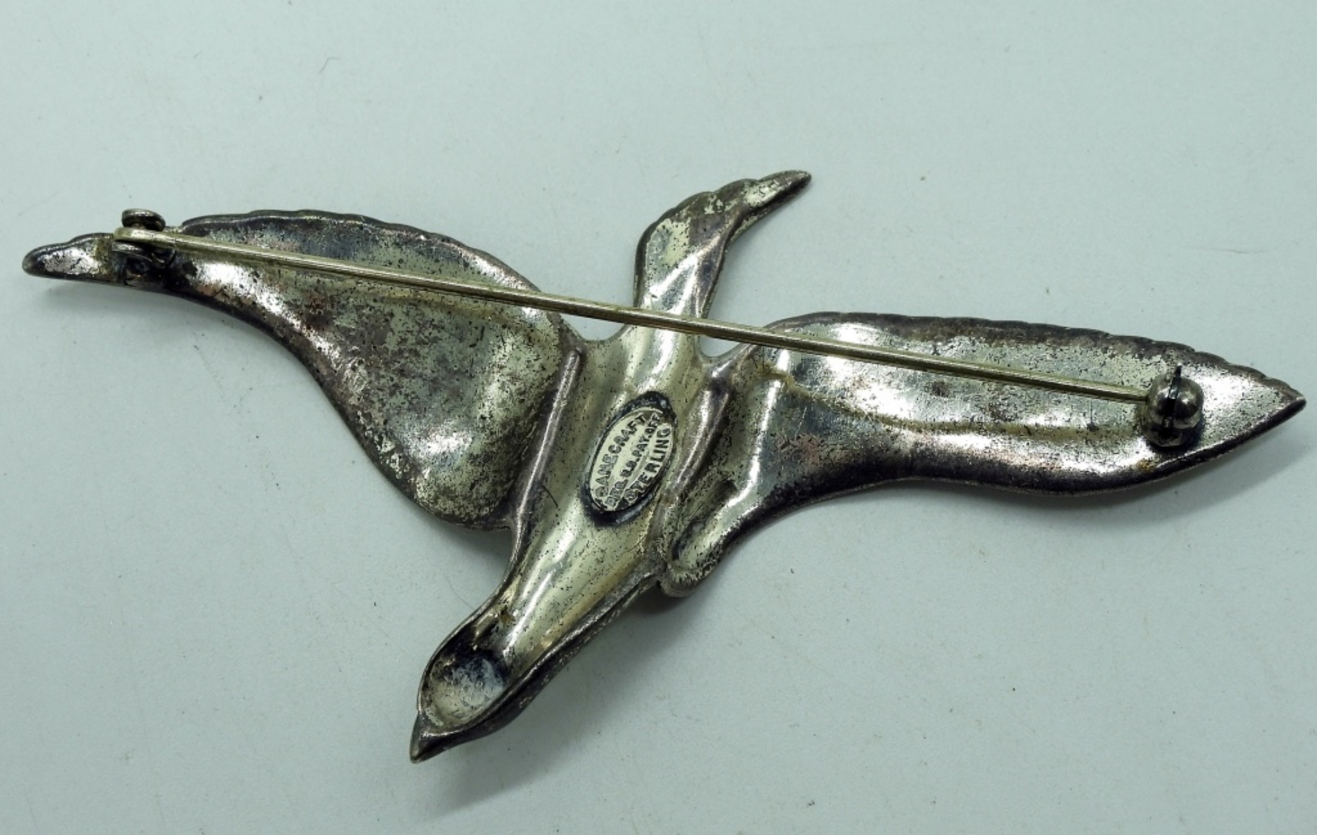 Dane Craft sterling bird brooch, 3.5″ x 2″. Mother of pearl inlay sterling pendant (1 3/4″) on a 16″ sterling chain. (22.1 dwt) (6x4x2)