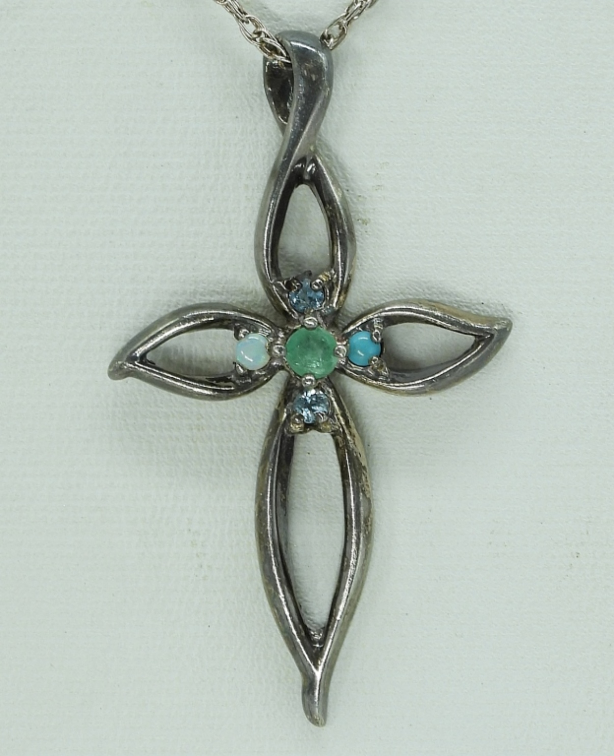 Four sterling cross pendants with a few gemstones. 1.5″ – 2.5″. Sterling chain is 20″ long. (19 dwt) (6x4x2)