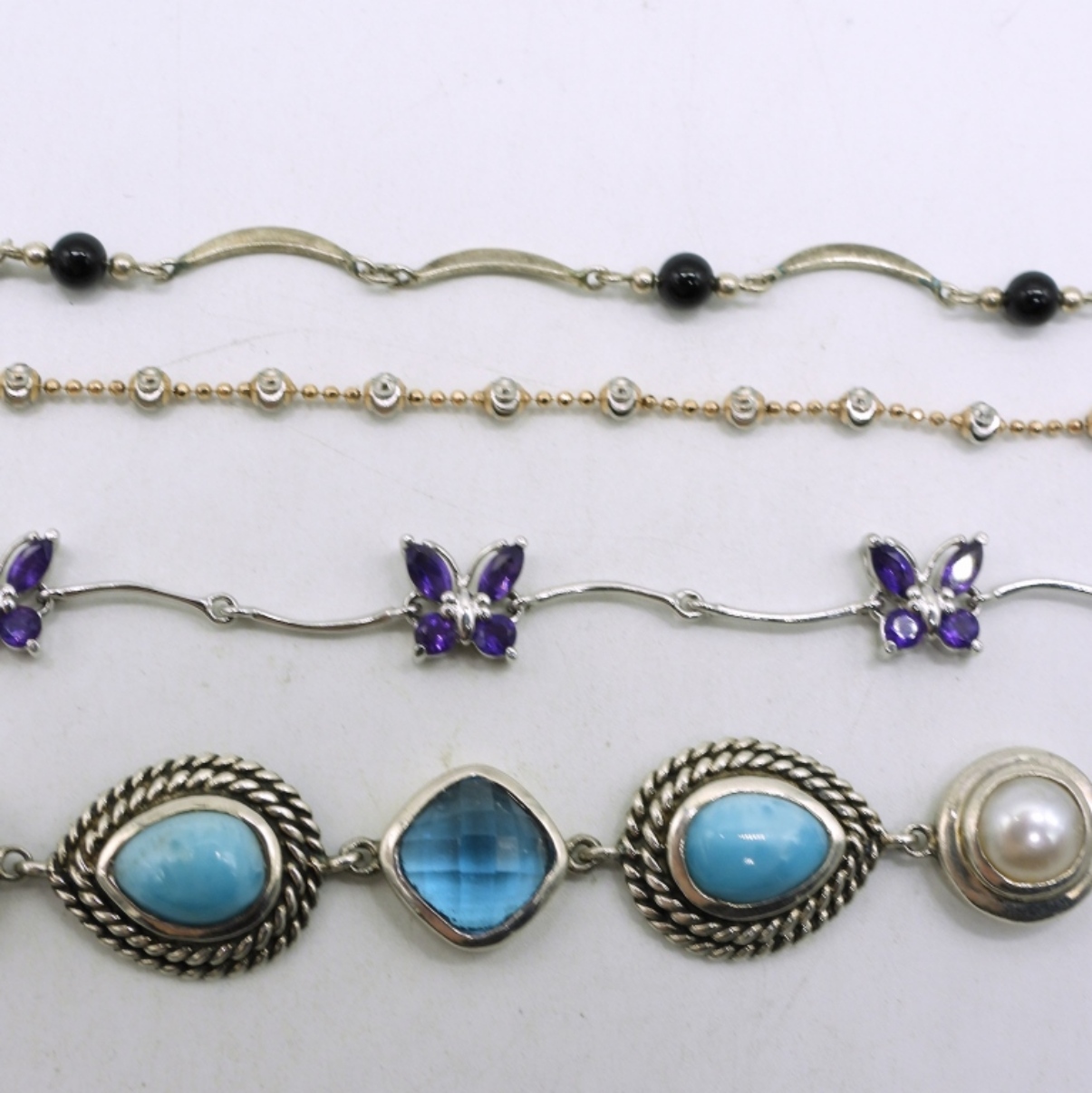 Four sterling bracelets with amethyst, blue topaz & larimar. (25 dwt)