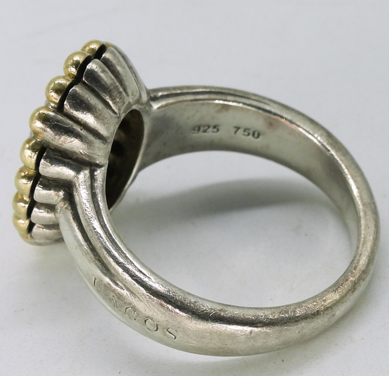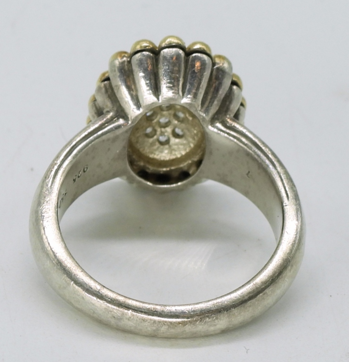 Sterling ring with 18k yellow gold accents. 20 small round diamonds (tested). Size 7. (4.9 dwt) 6x4x2