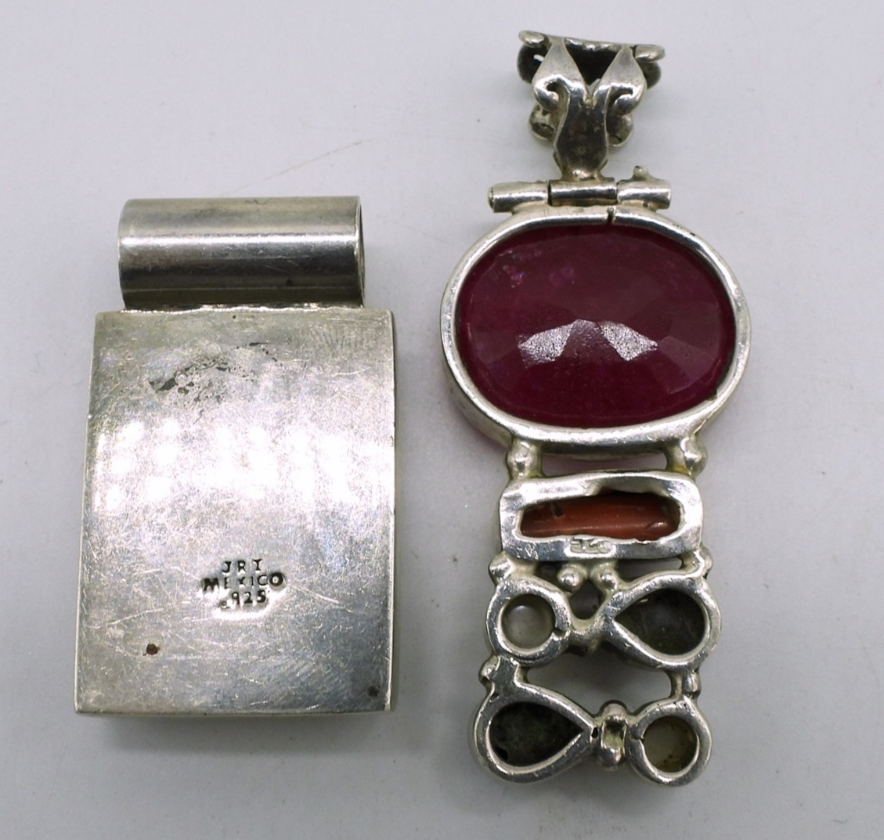 Two sterling pendants, 1.5″ & 2 1/4″ long. Red Jasper “JRI Mexico 925” pendant. Ruby, Pearl & other Gemstones. (20 dwt) (6x4x2)