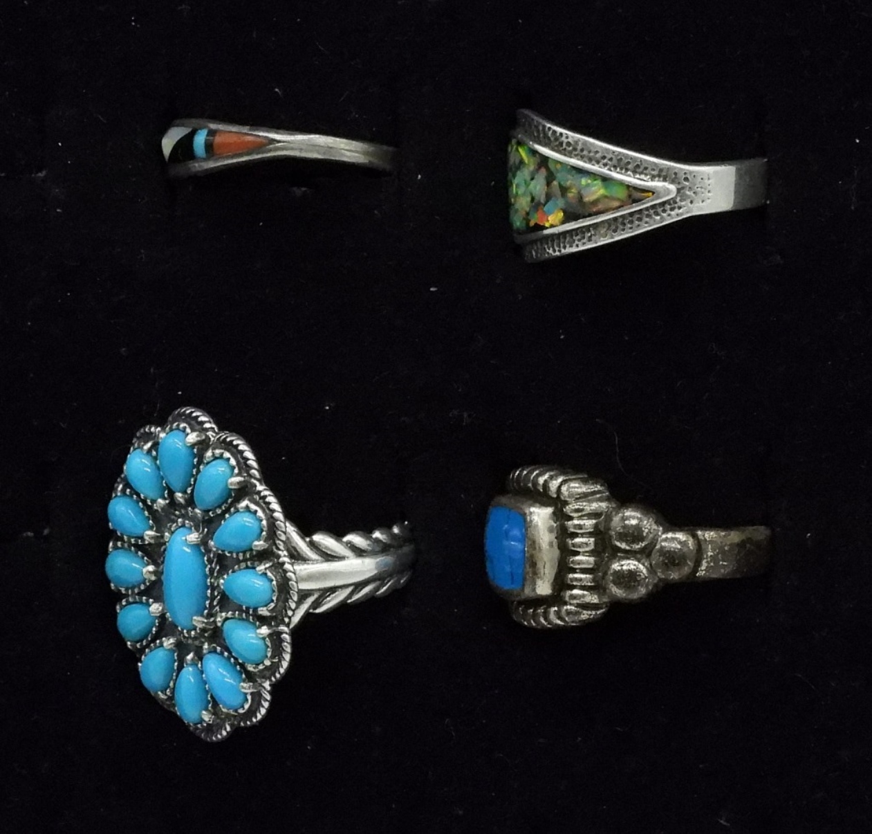 Four sterling rings with turquoise and opal gemstones. Size 7. (13 dwt) (6x4x2)