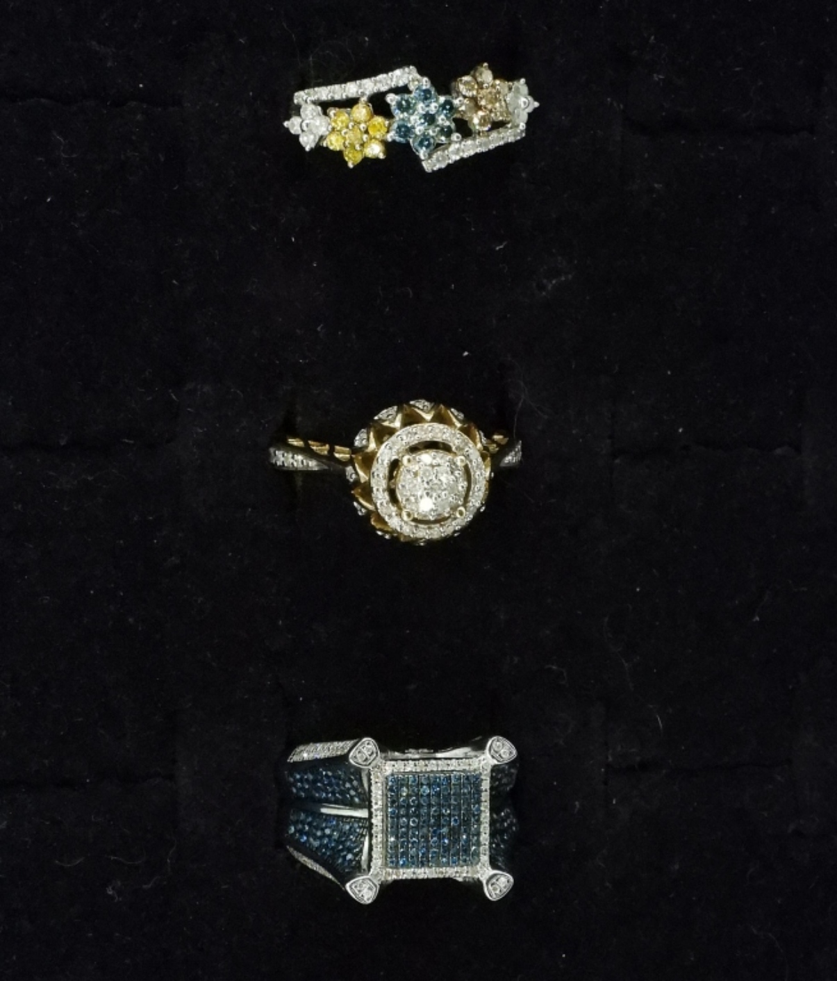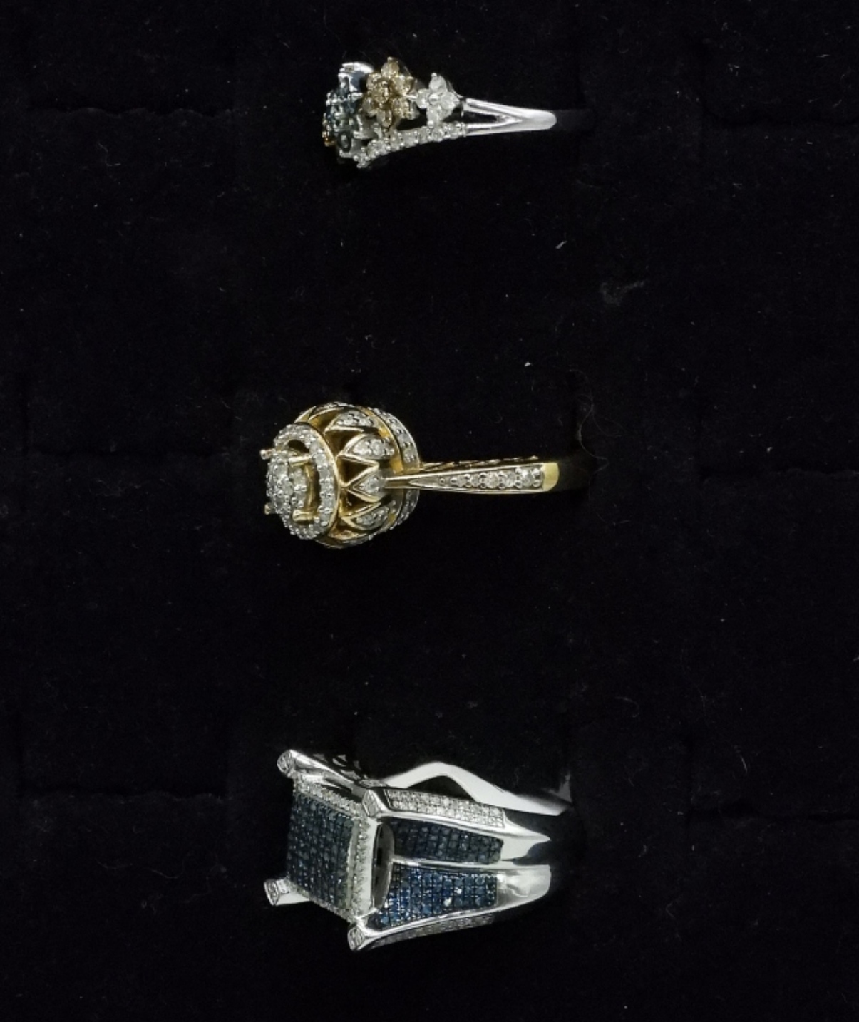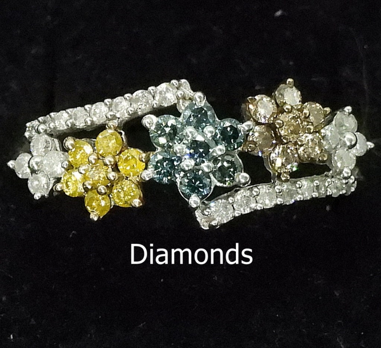 JTV sterling ring new with tag, 1/2 carat white and blue moissanite, size 7. Gold tone sterling ring with moissanite gemstones, size 7. Colored diamond sterling ring, five diamond flowers, size 7. (10 dwt) (6x4x2)