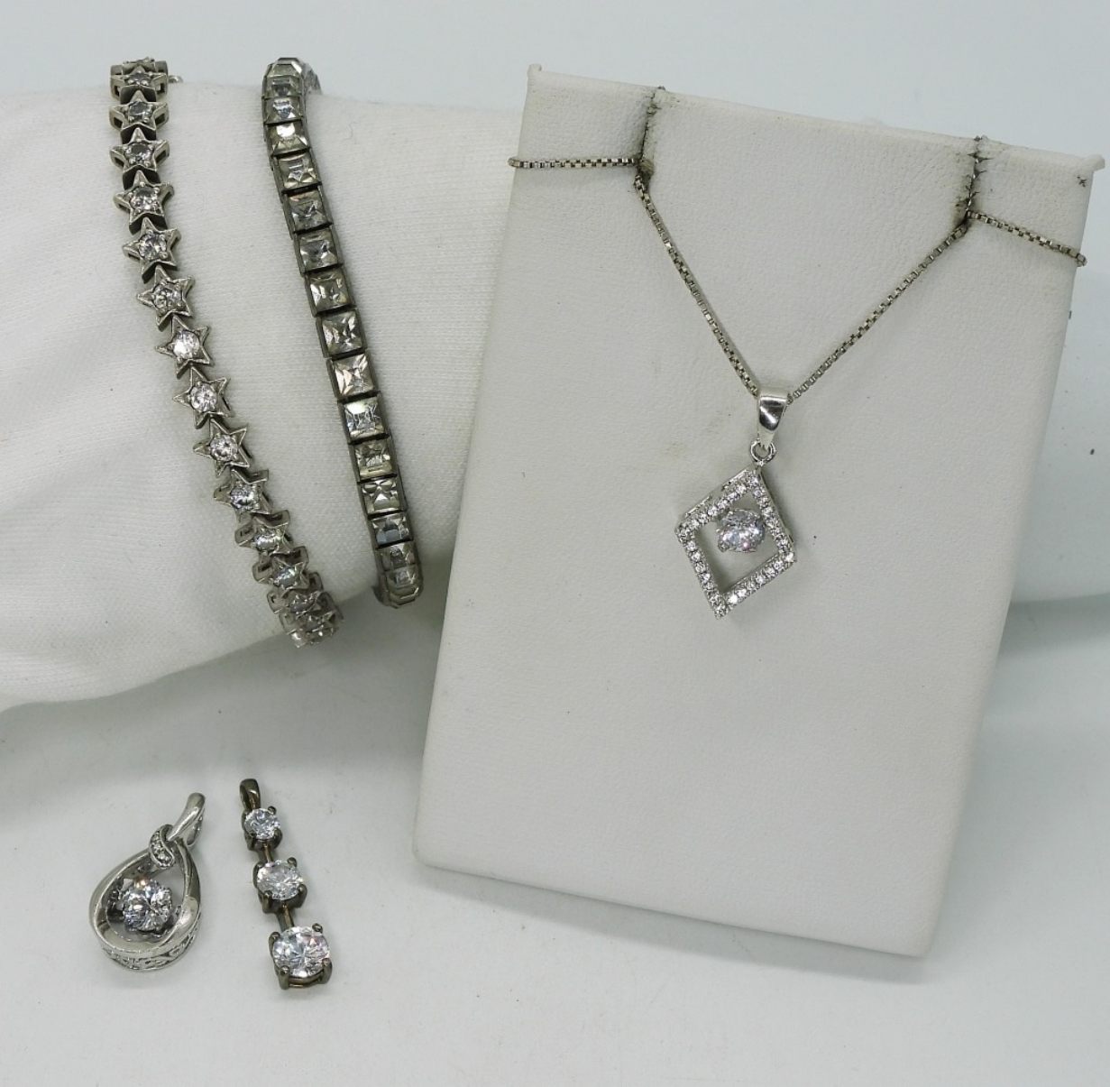 Three sterling simulated diamond pendants, one chain 20″. Two sterling bracelets, 7-8″. (22.3 dwt)