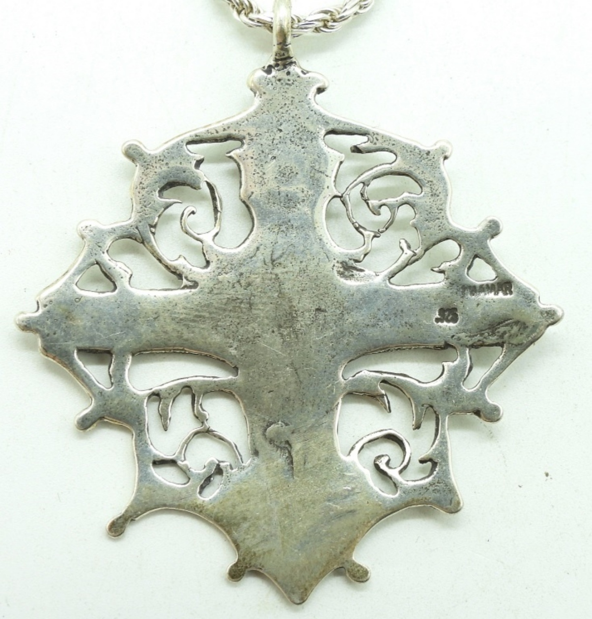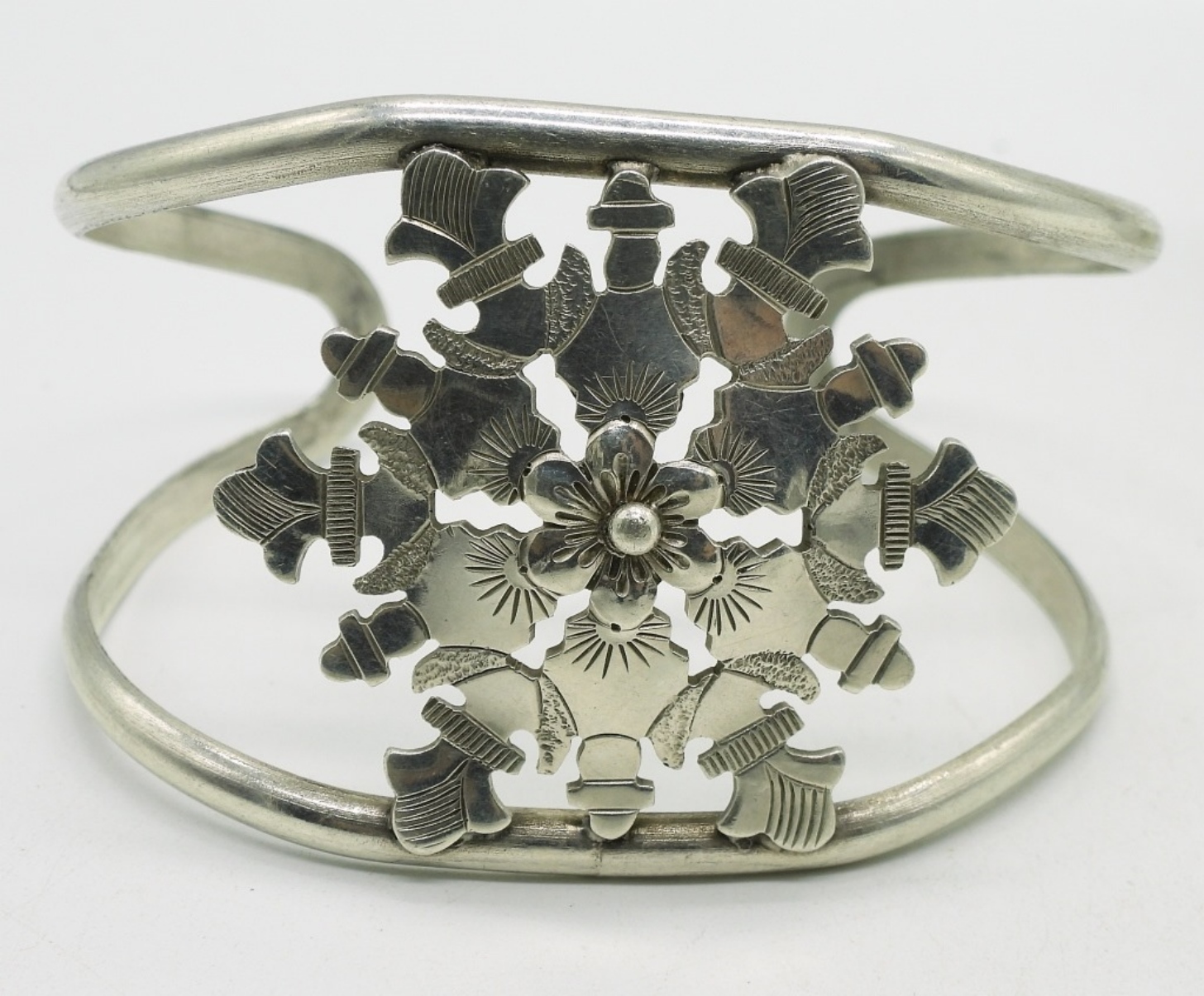 Sterling cuff bracelet with large snow flake design, 7″. Pretty sterling pendant, 2″ on a 20″ chain. (28.3 dwt)