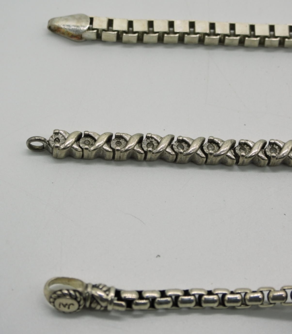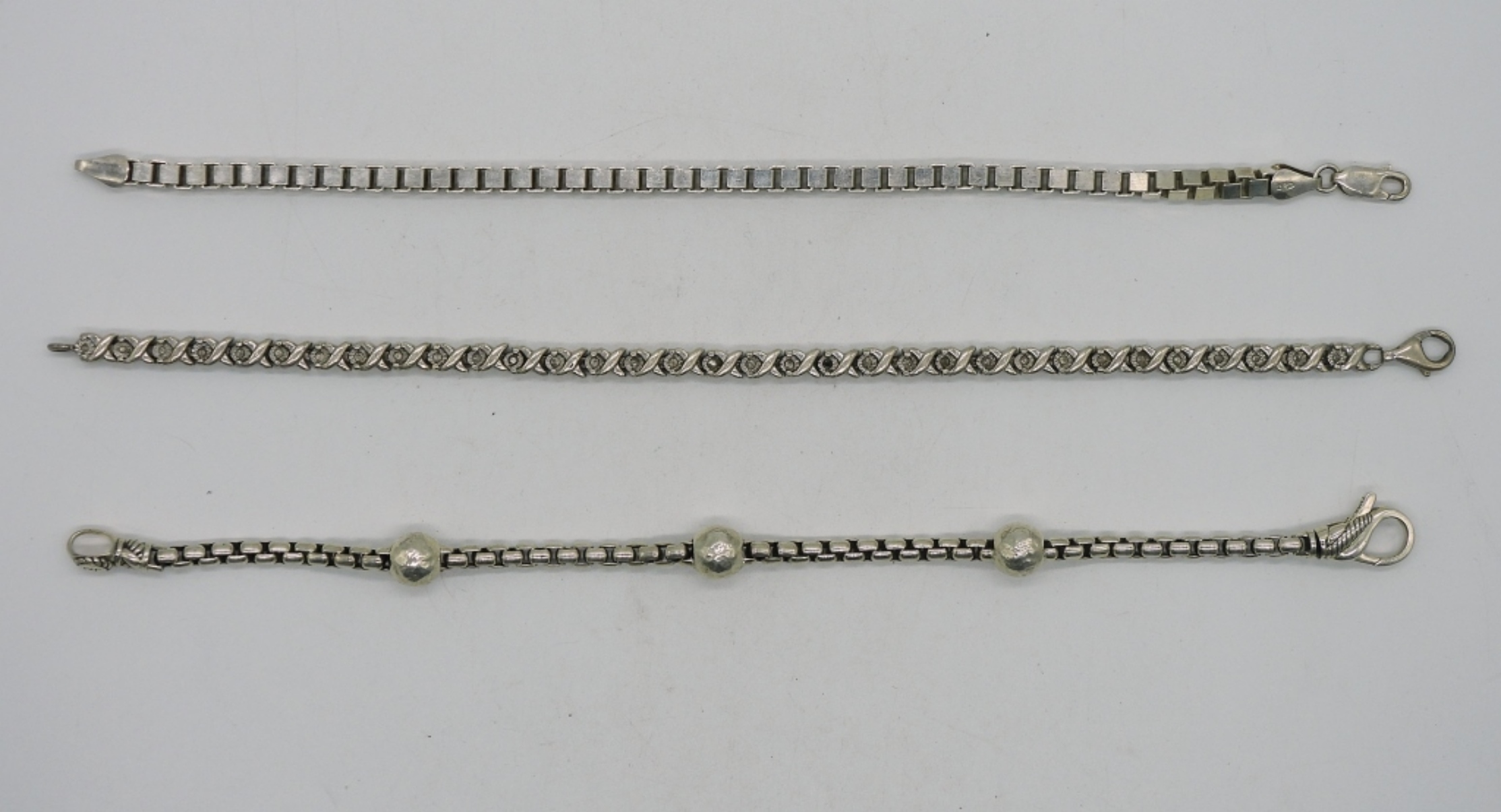 Three sterling silver chain bracelets, 7.5-8″. (29.3 dwt)