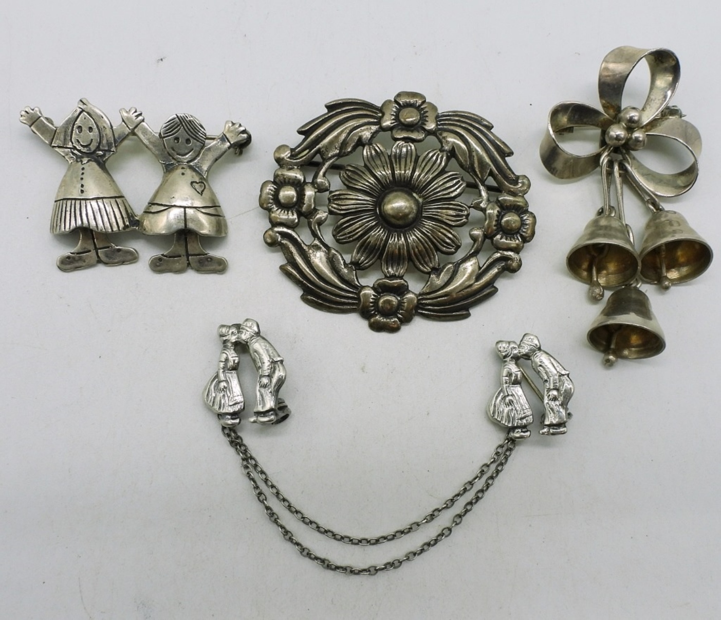Danecraft floral brooch 2″. Taxco bow and bells brooch, 2″. Two other sterling pins. (23.9 dwt)