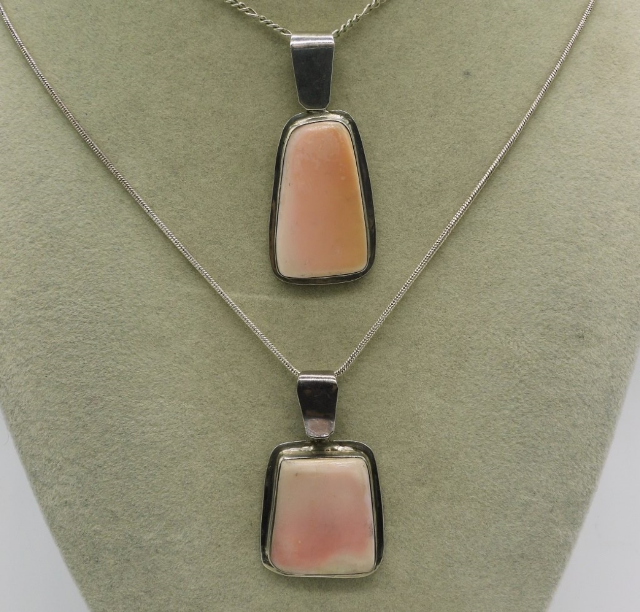 Two sterling light pink gemstone necklaces, 18″ & 30″. Two sterling, light pink gemstone bracelets. (28 dwt) 6x4x2