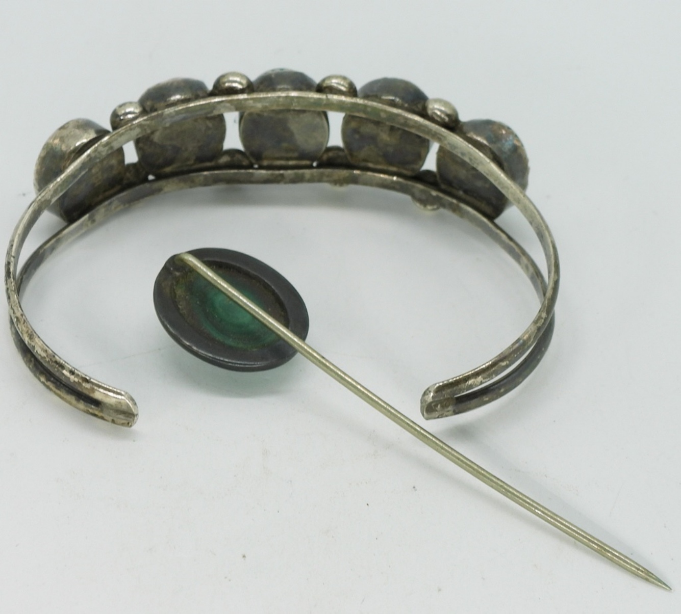 Malachite sterling bracelet, cuff style. Vintage sterling malachite stick pin, 2.5″ long. (15 dwt) (6x4x2)