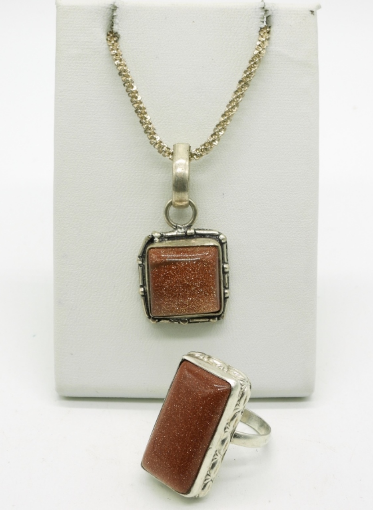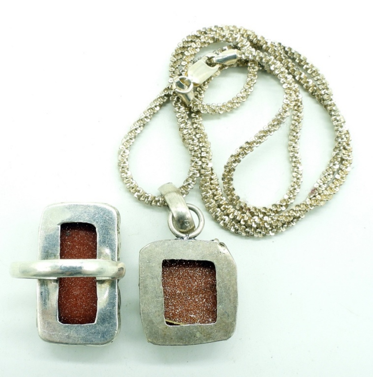 Goldstone gemstone ring size 9. Goldstone pendant, 1.5″ long on a sterling 20″ chain. (18 dwt) (6x4x2)