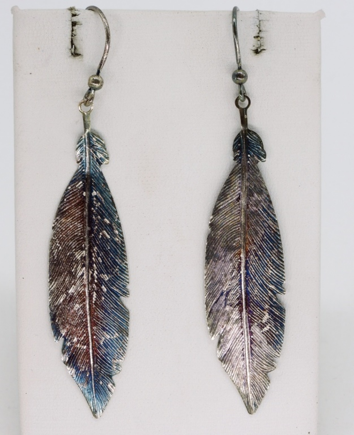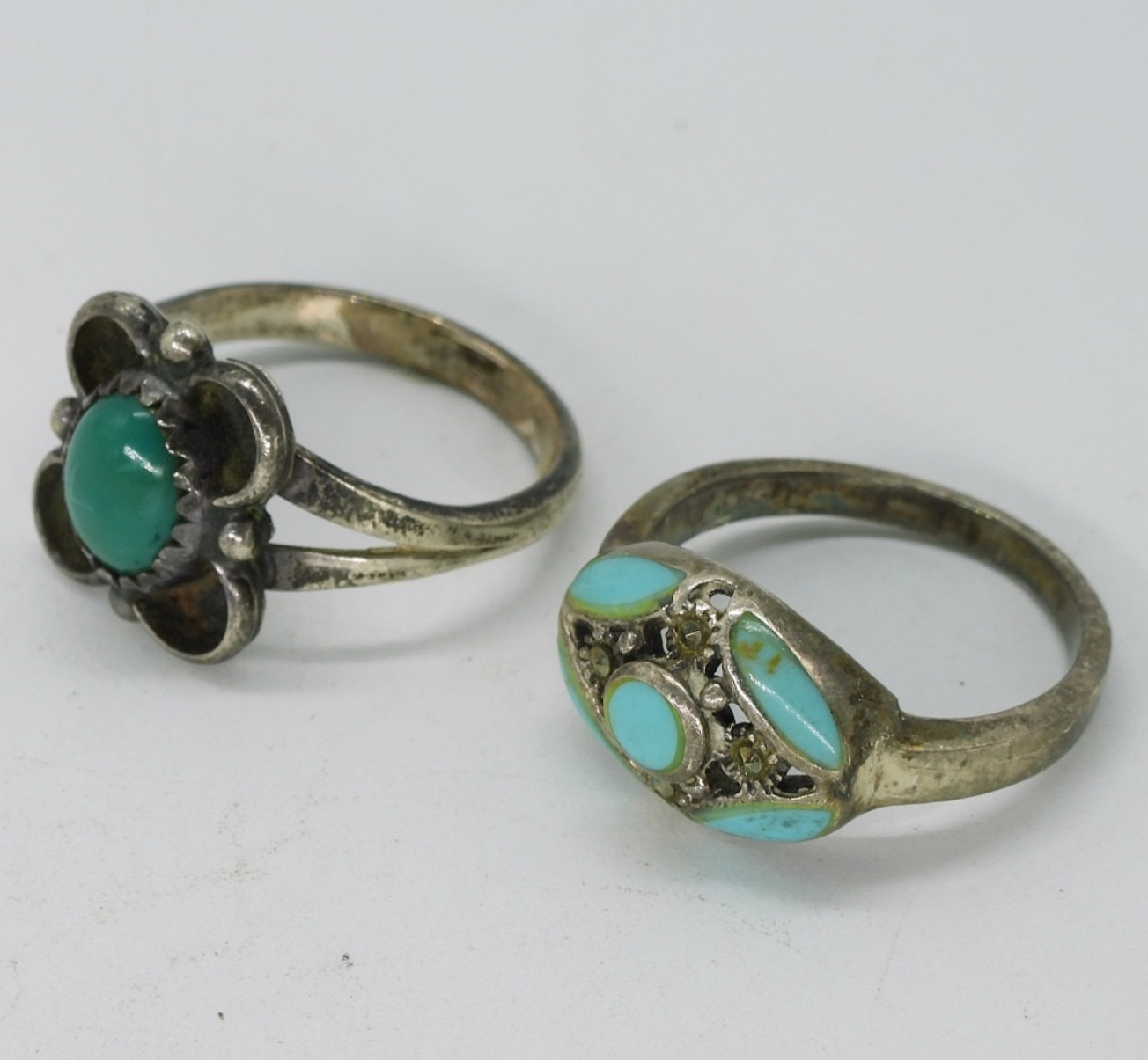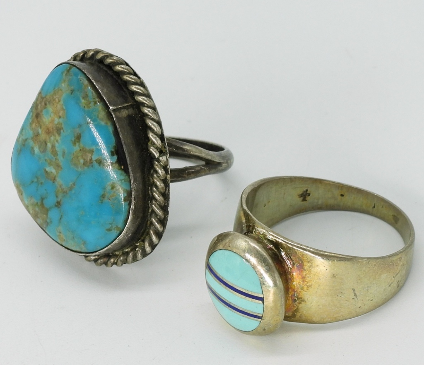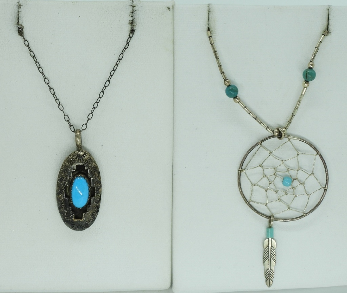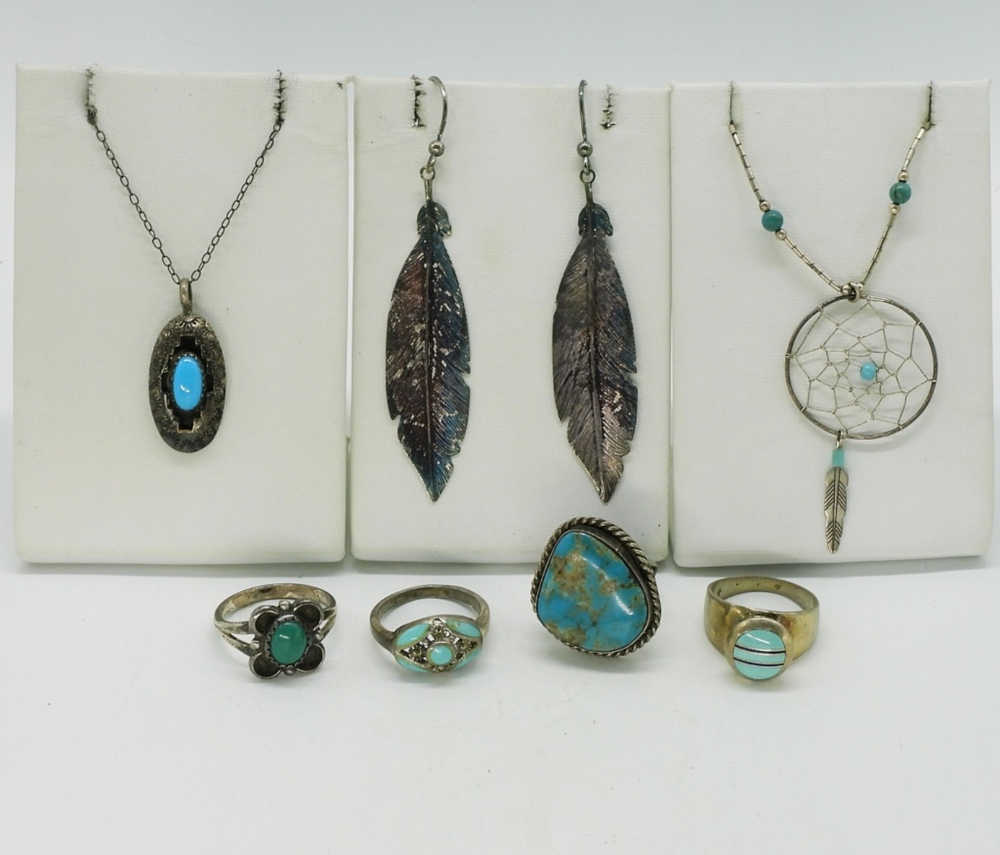 Two sterling necklaces, 16″ & 20″. One pair pierced sterling feather earrings, 3″ long. Four sterling turquoise rings, sizes 6,7,8. (19 dwt) (6x4x2)