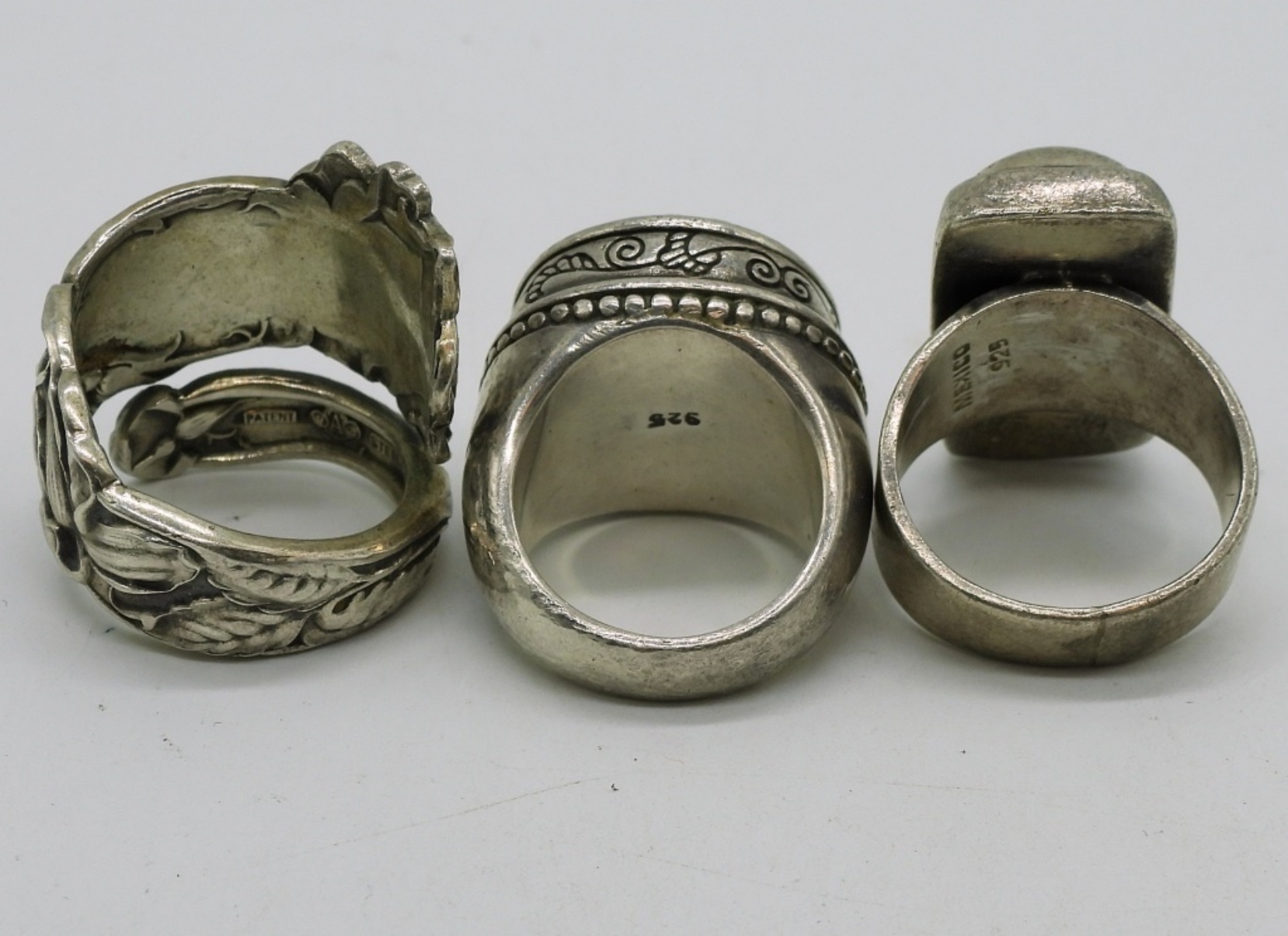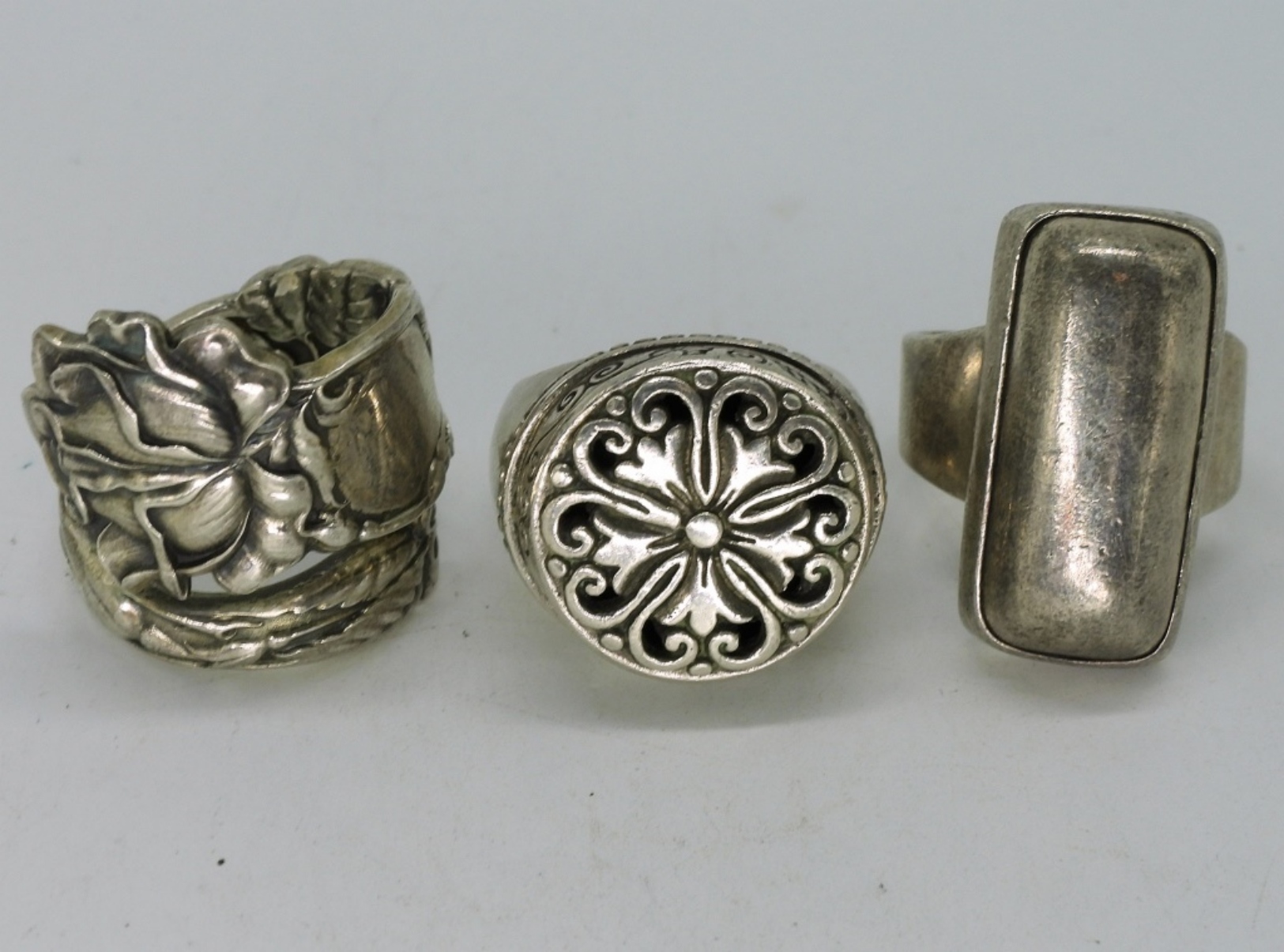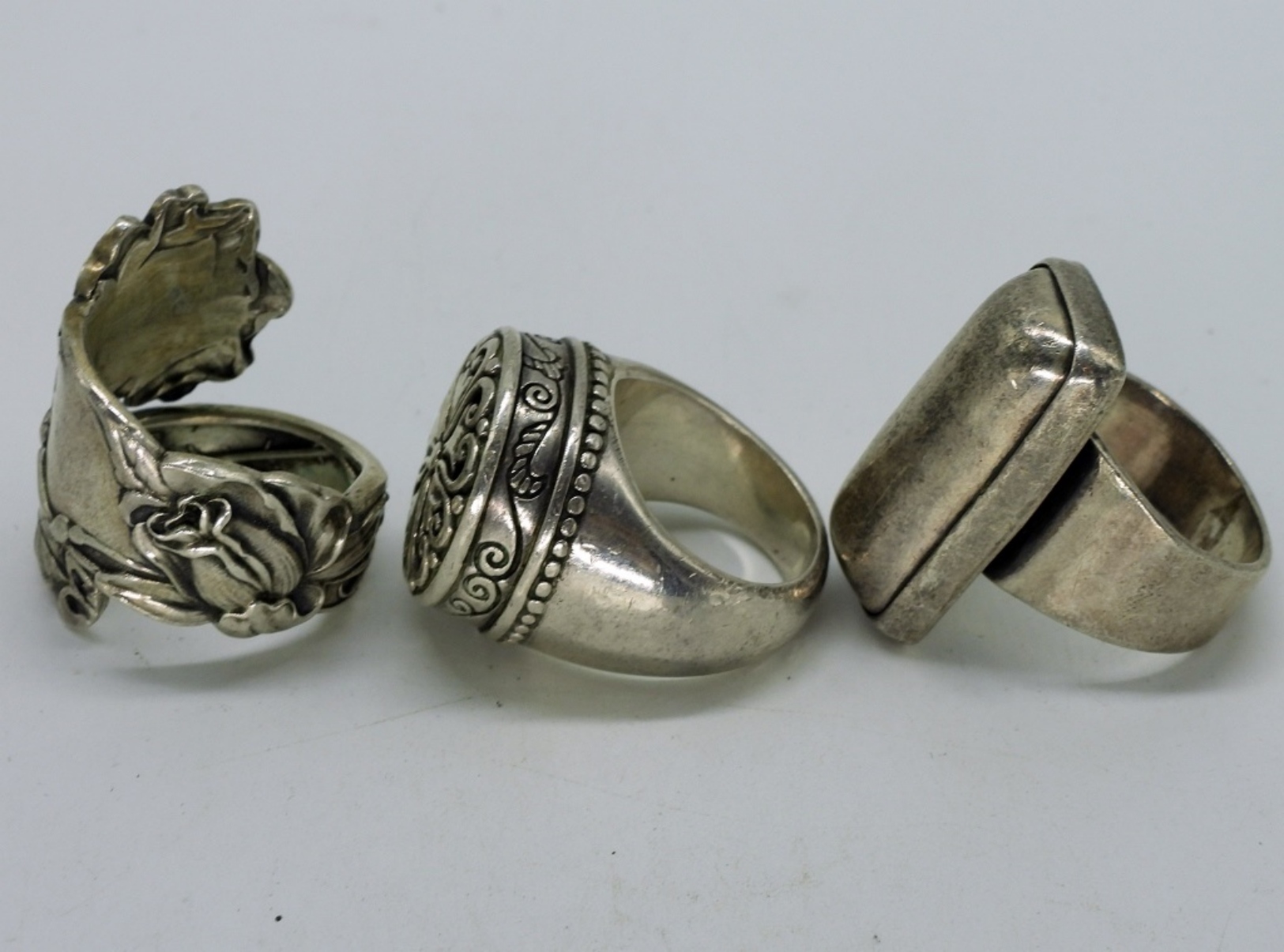 Three heavy sterling fashion rings. Very unique pieces. Sizes 5.5, 8, 9. (31.5 dwt) (6x4x2)