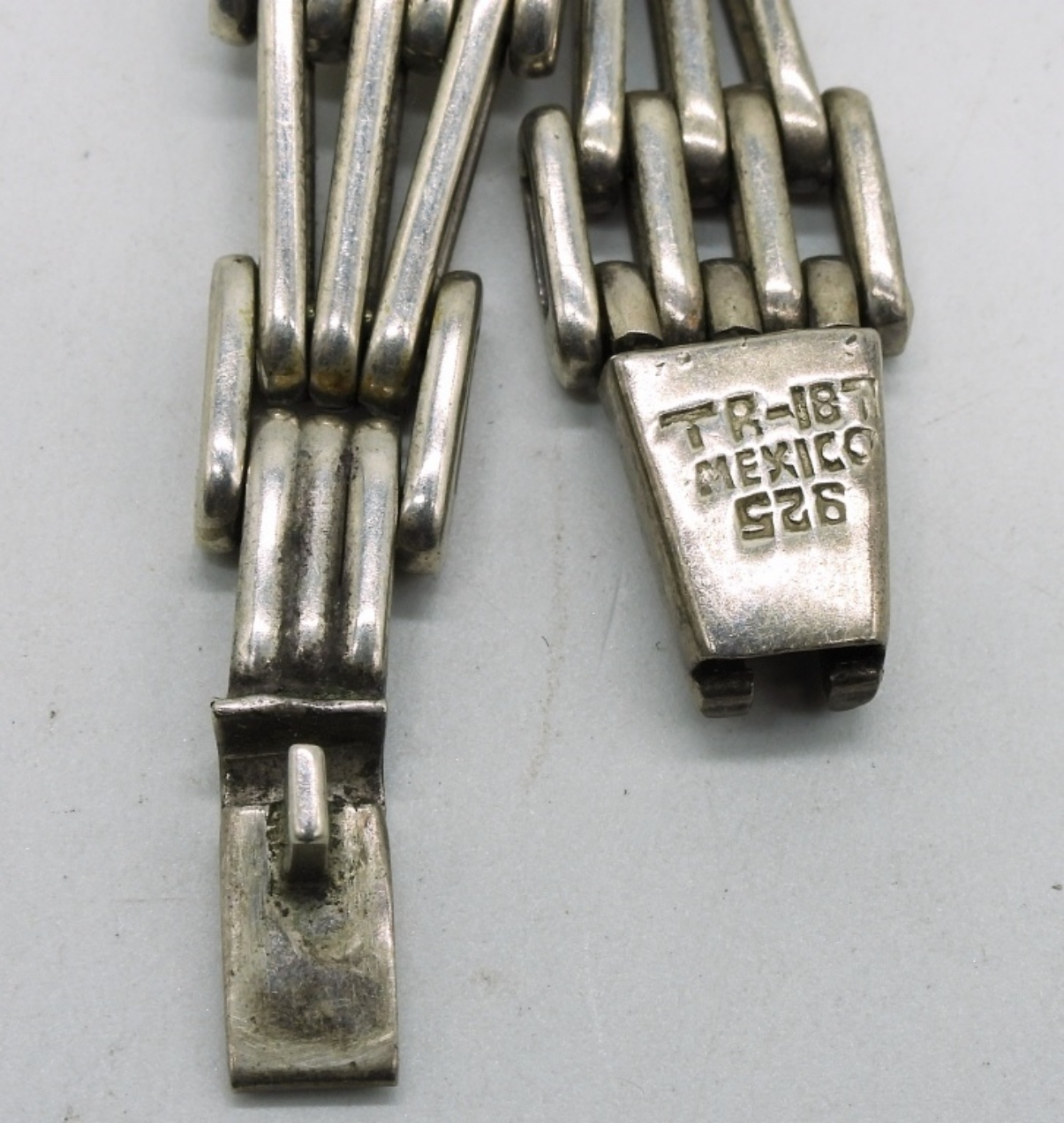 Vintage Taxco Mexico sterling interlocking panel bracelet, 7″ long. Marked “TR-187 Mexico 925”. Claps works. (25.9 dwt) (6x4x2)