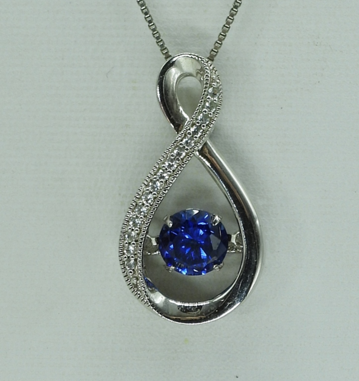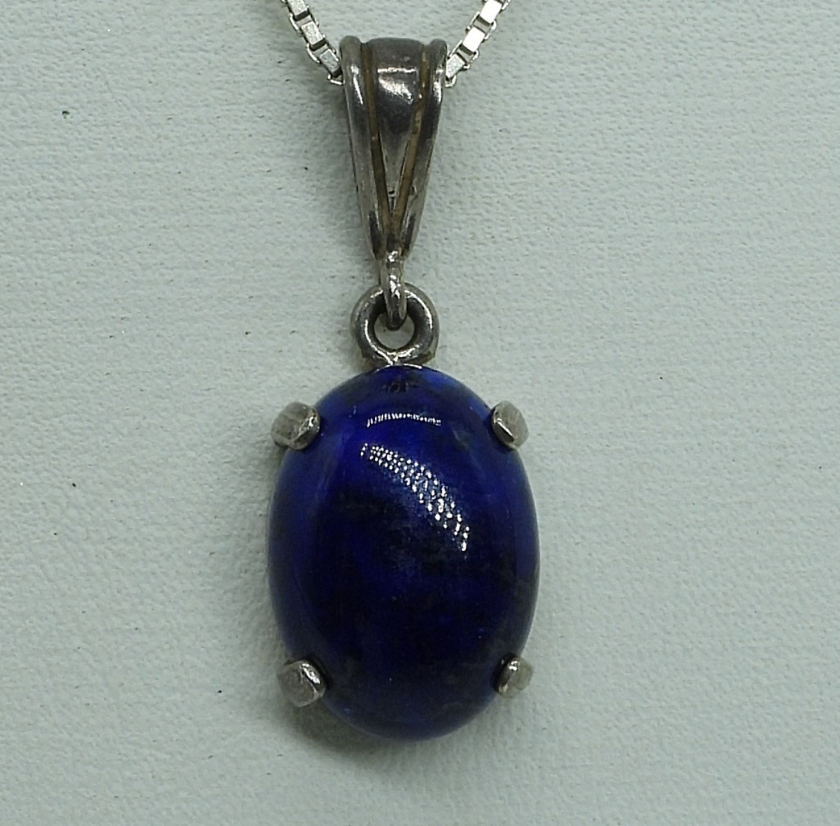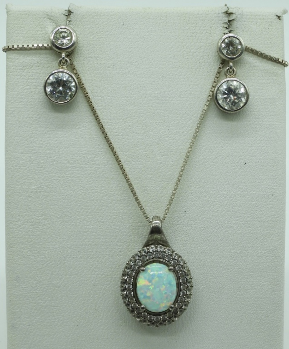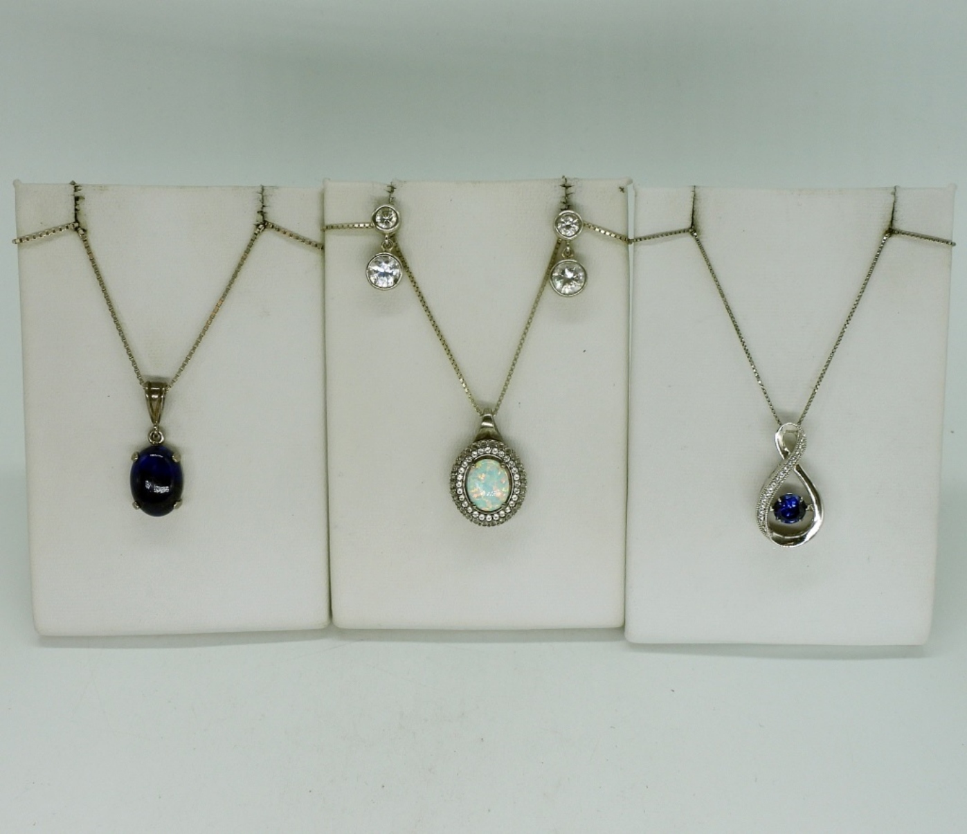 Three sterling necklaces with Opal, Sapphire (Lab Created) & Lapis Lazuli gemstones. Chains are 18″ & 20″ long. One pair sterling pierced earring with simulated diamonds. (10.5 dwt) (6x4x2)