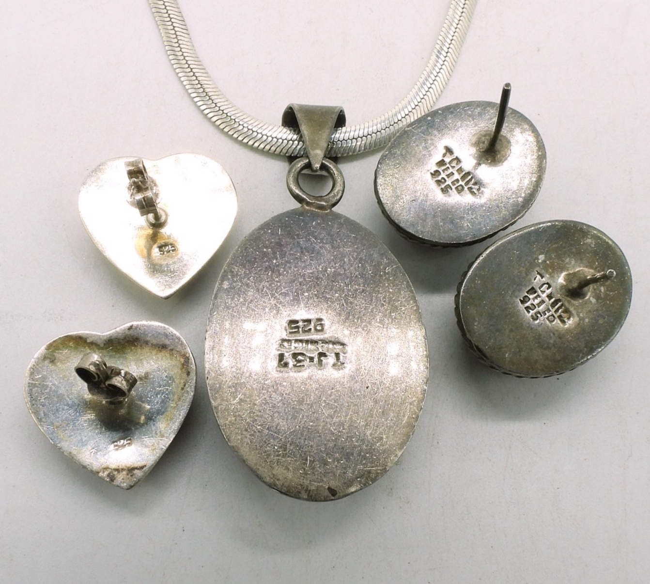 Two pair of sterling pierced earrings, lapis lazuli gemstones. Oval earrings are Taxco. Taxco Sodalite gemstone pendant (2″ long) on a sterling 18″ chain. (23.7 dwt)