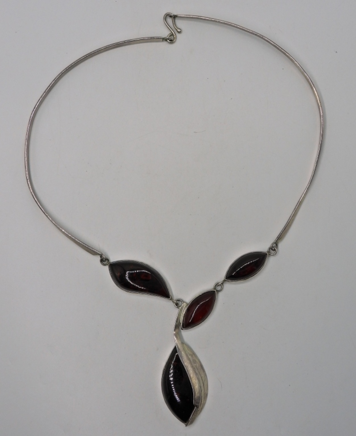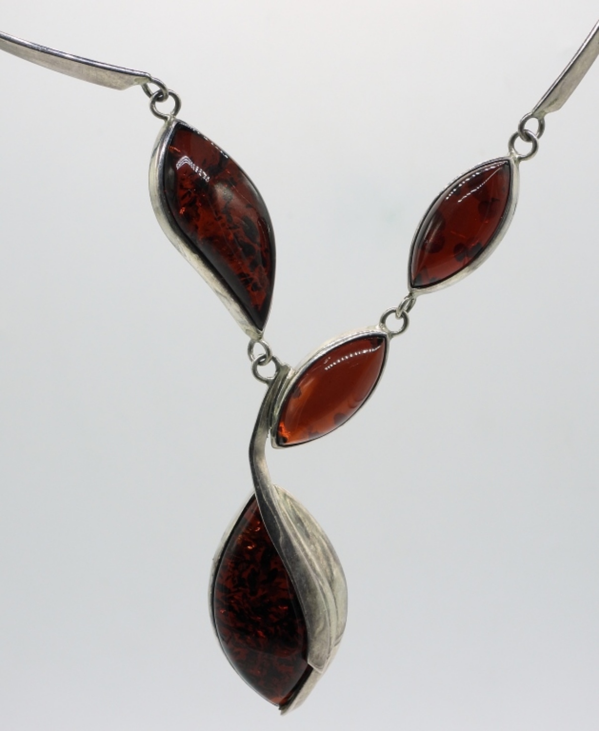Four large chunks of Amber set it a sterling silver statement necklace. Approximately 20″. (39 dwt)