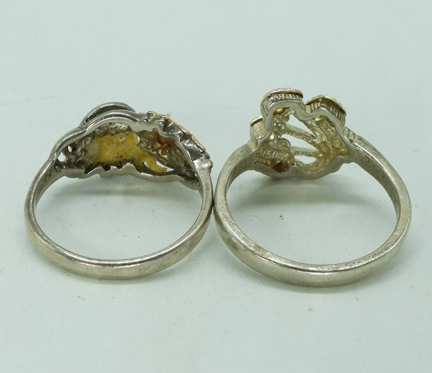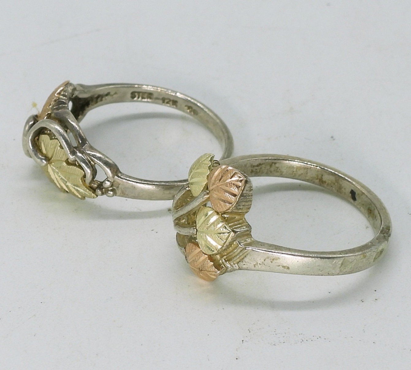 These are Black Hills Gold style pieces. Sterling and some 12k gold overlay. Bracelet is 7″ long. Two sterling rings, size 6. (8.5 dwt) (6x4x2)