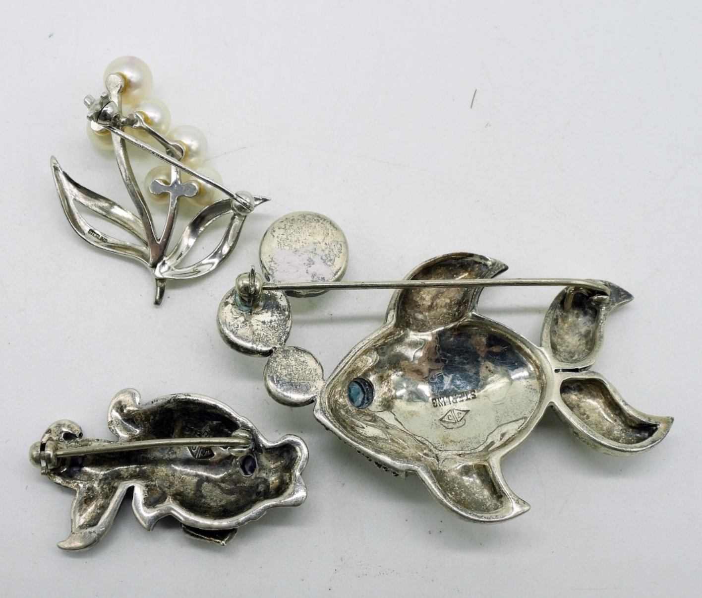 Two sterling Judith Jack fish brooches, 1.5″ & 2″ wide. One sterling flower brooch with pearls, 1.5″ tall. (19 dwt) (6x4x2)