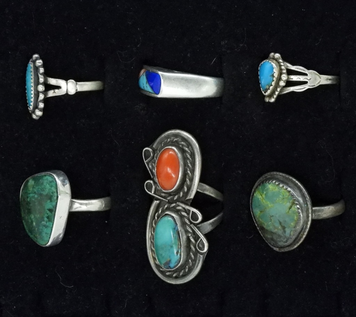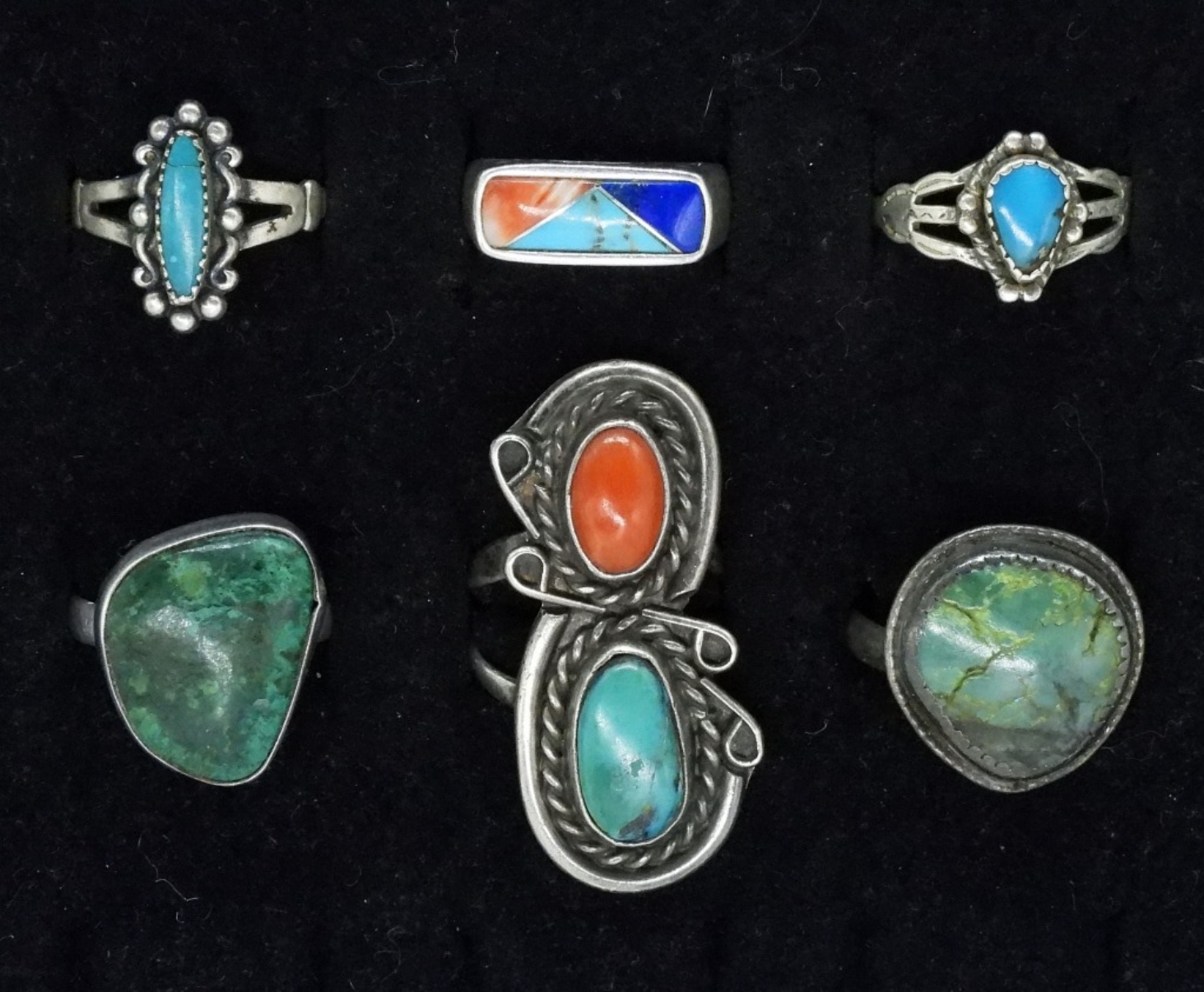 Six sterling turquoise rings. Sizes 6-7.5 (19.4 dwt) (6x4x2)