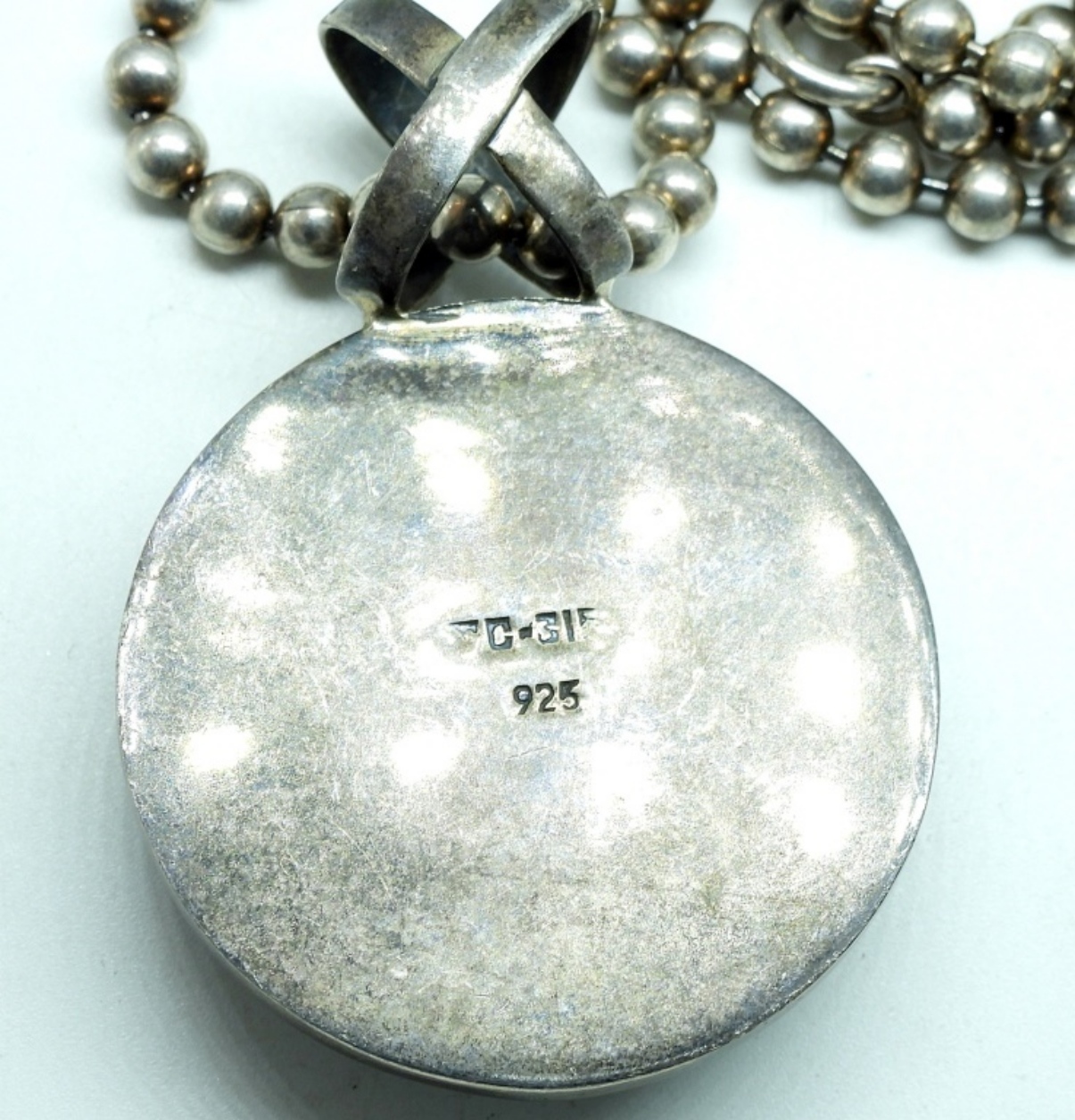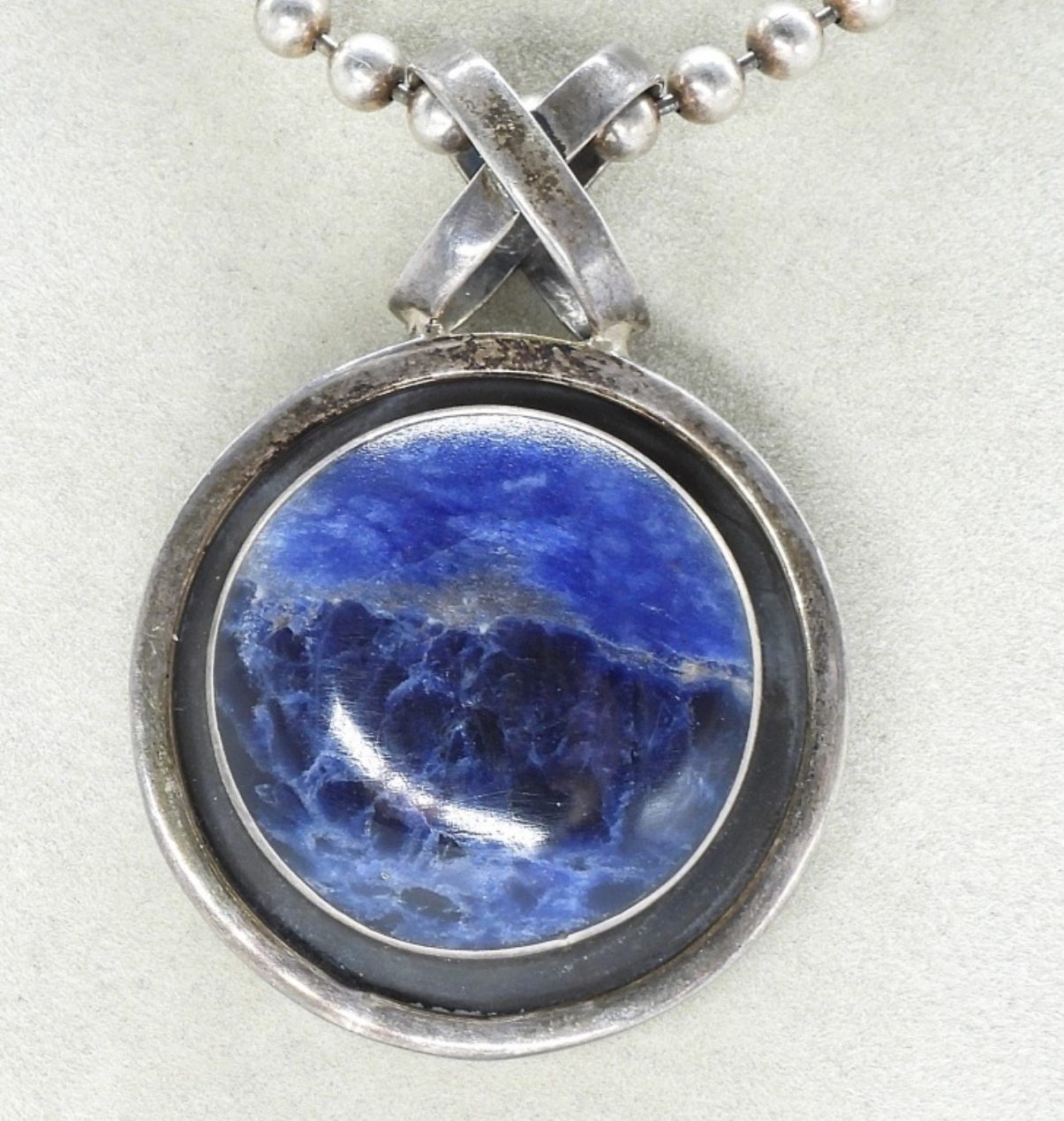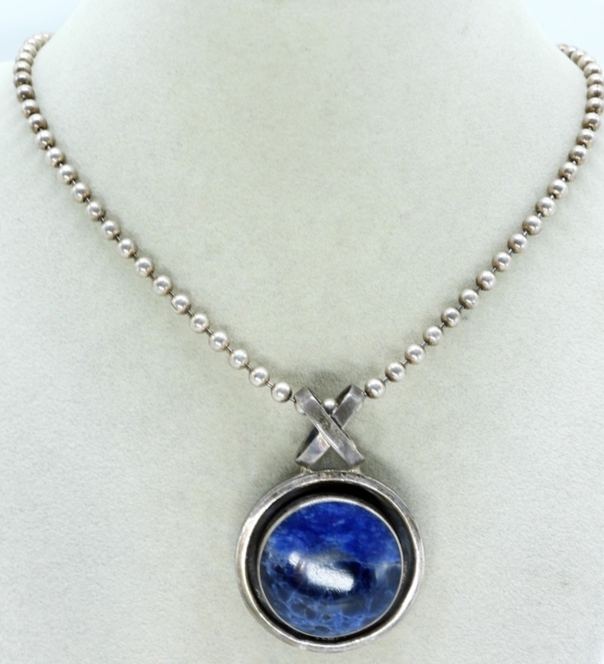 Sterling Taxco Mexico, sodalite gemstone pendant (2″ long) on a sterling ball chain 18″ long. (TC-315 925) – (21 dwt) (6x4x2)
