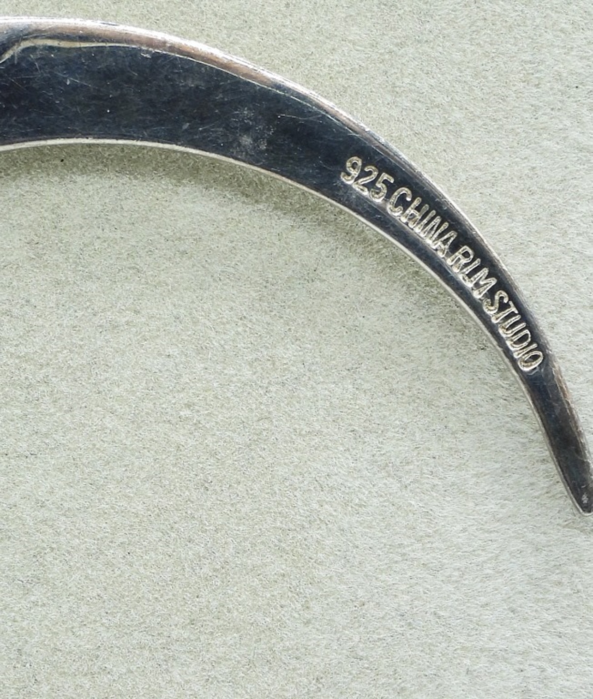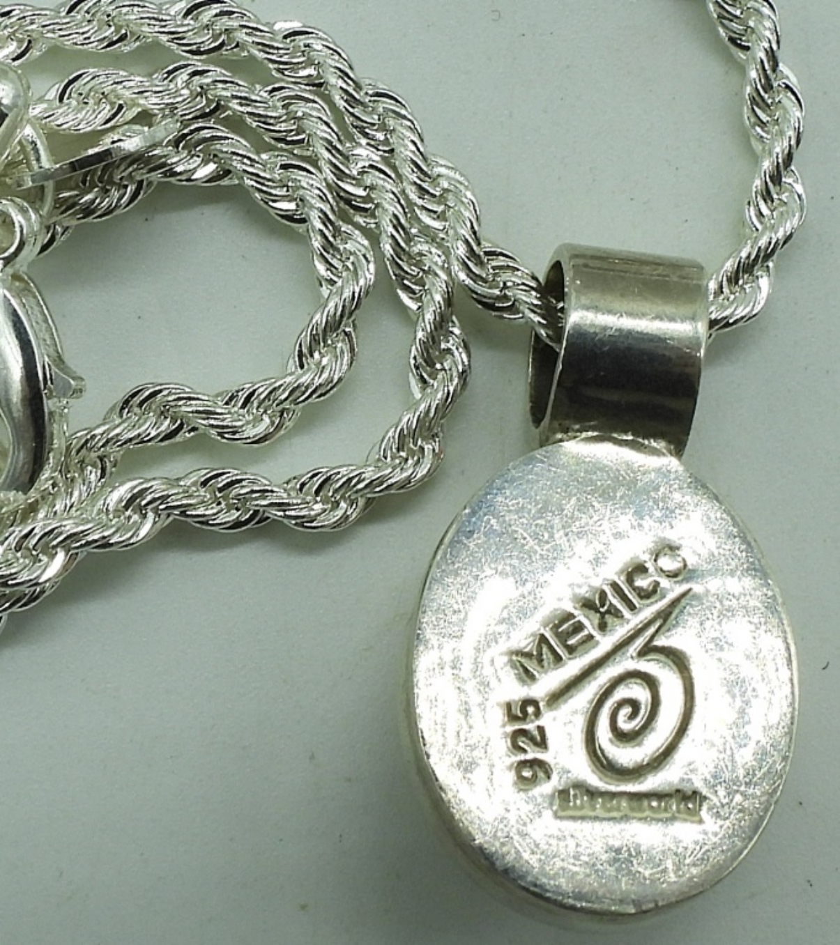 RLM Studios crescent moon pendant, 3″ long. On a 18″ long chain. Mexico sterling oval pendant, 1″ long on a sterling 16″ chain. (18.4 dwt) (6x4x2)