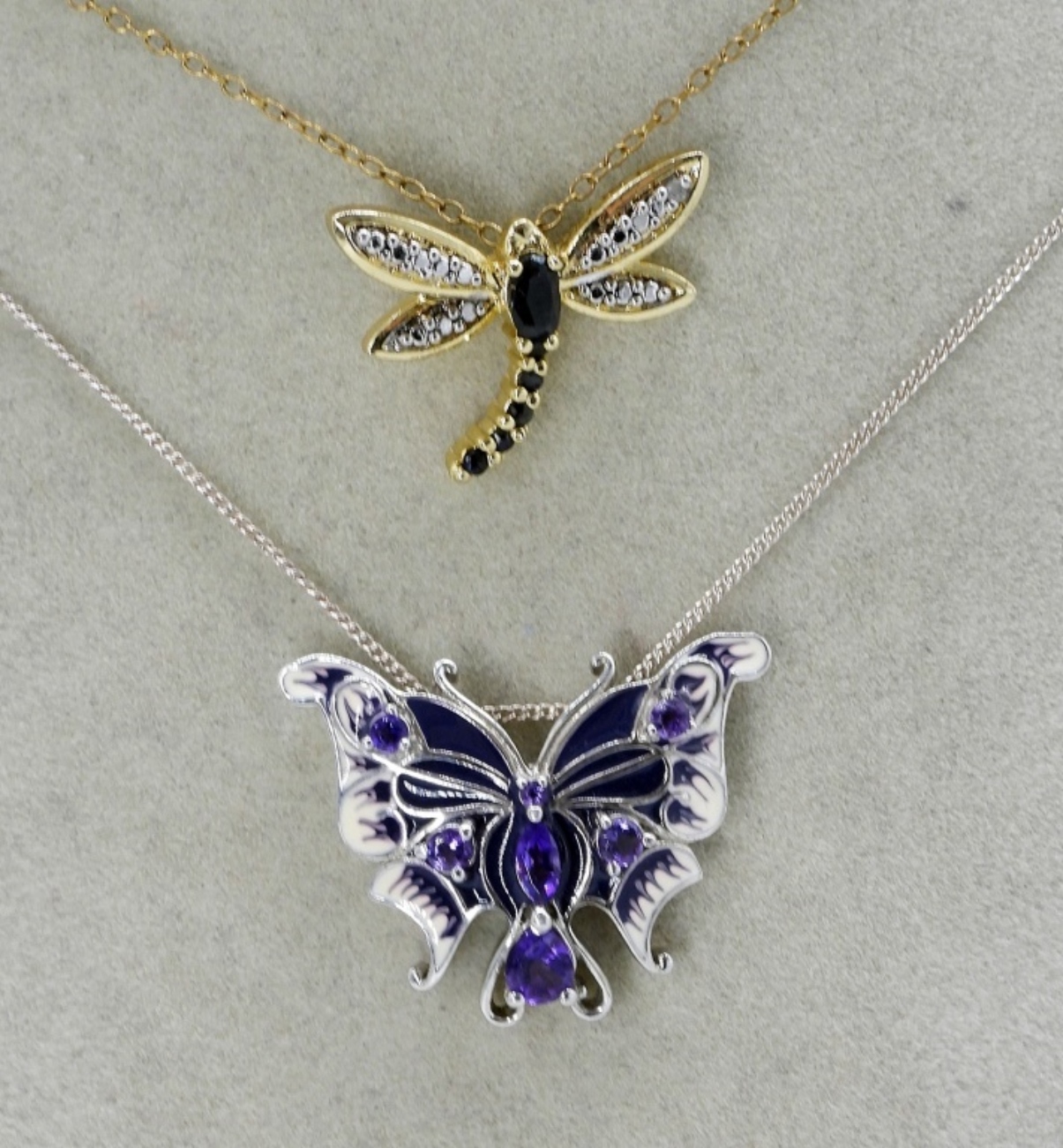 Two sterling necklaces, one gold toned. Dragonfly has dark gemstones, possibly sapphires, 21″ long chain. Butterfly with amethyst gemstones, white and purple enamel, on a 20″ chain. (6.2 dwt) (6x4x2)
