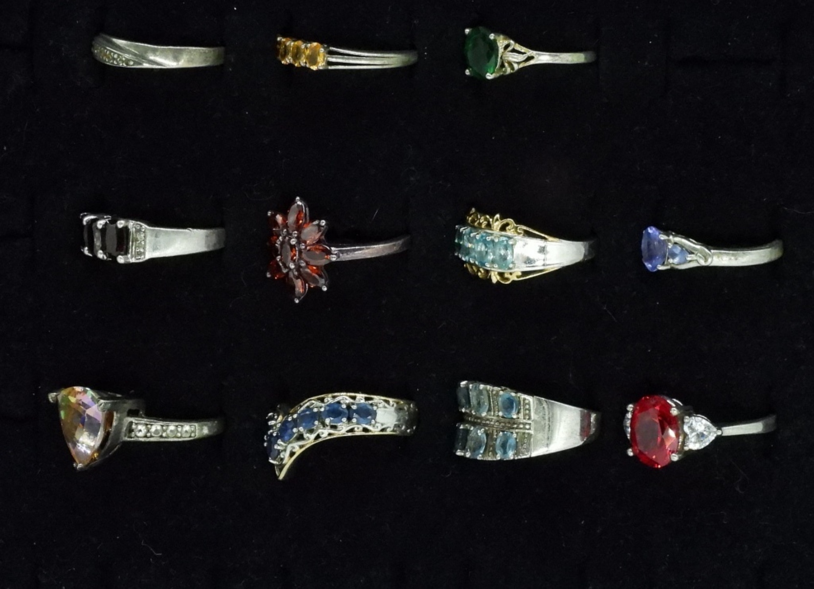 Eleven sterling gemstone fashion rings. Garnet, Blue topaz, Citrine & several simulated gemstones. Sizes 7-9 (25 dwt) (6x4x2)