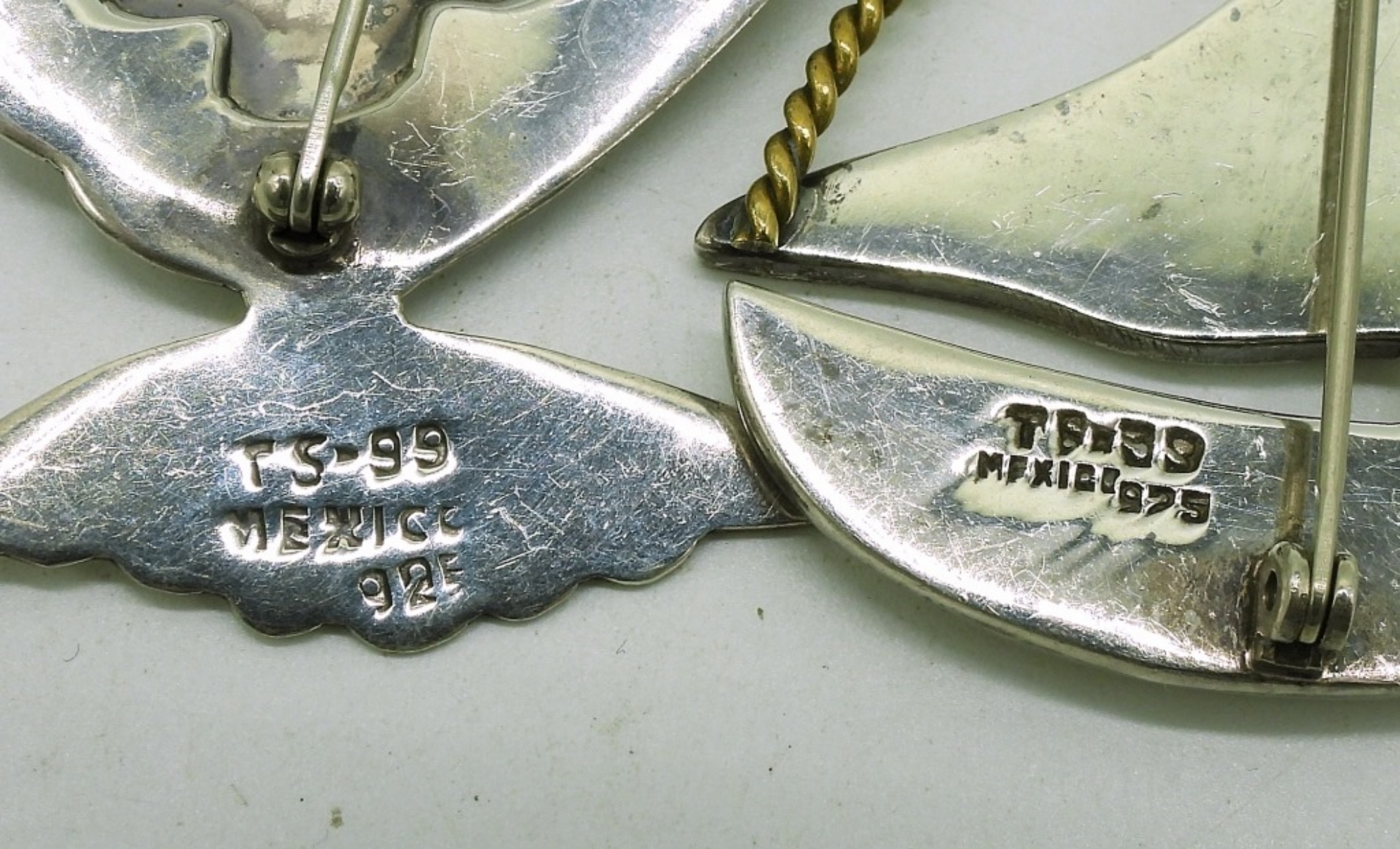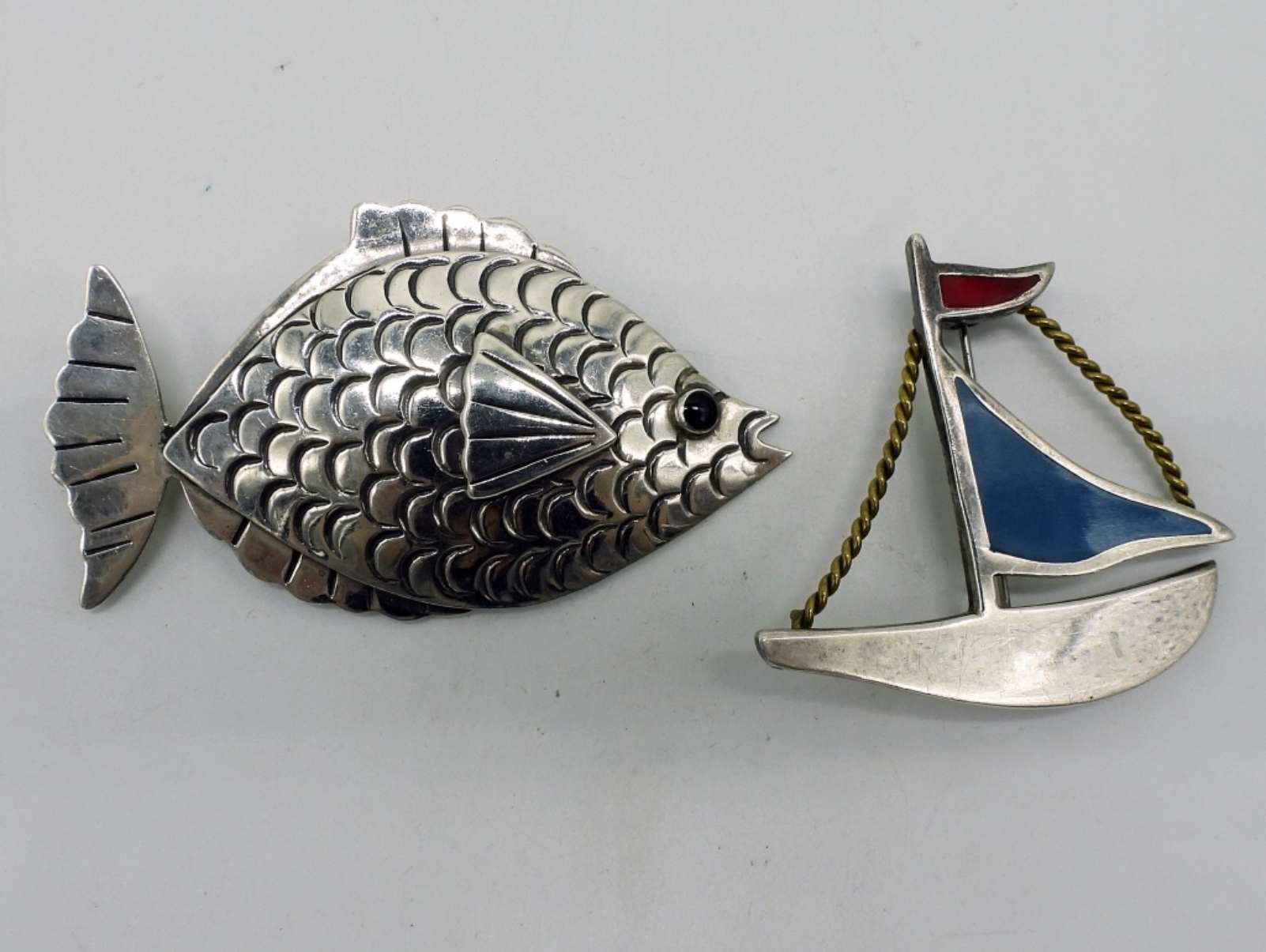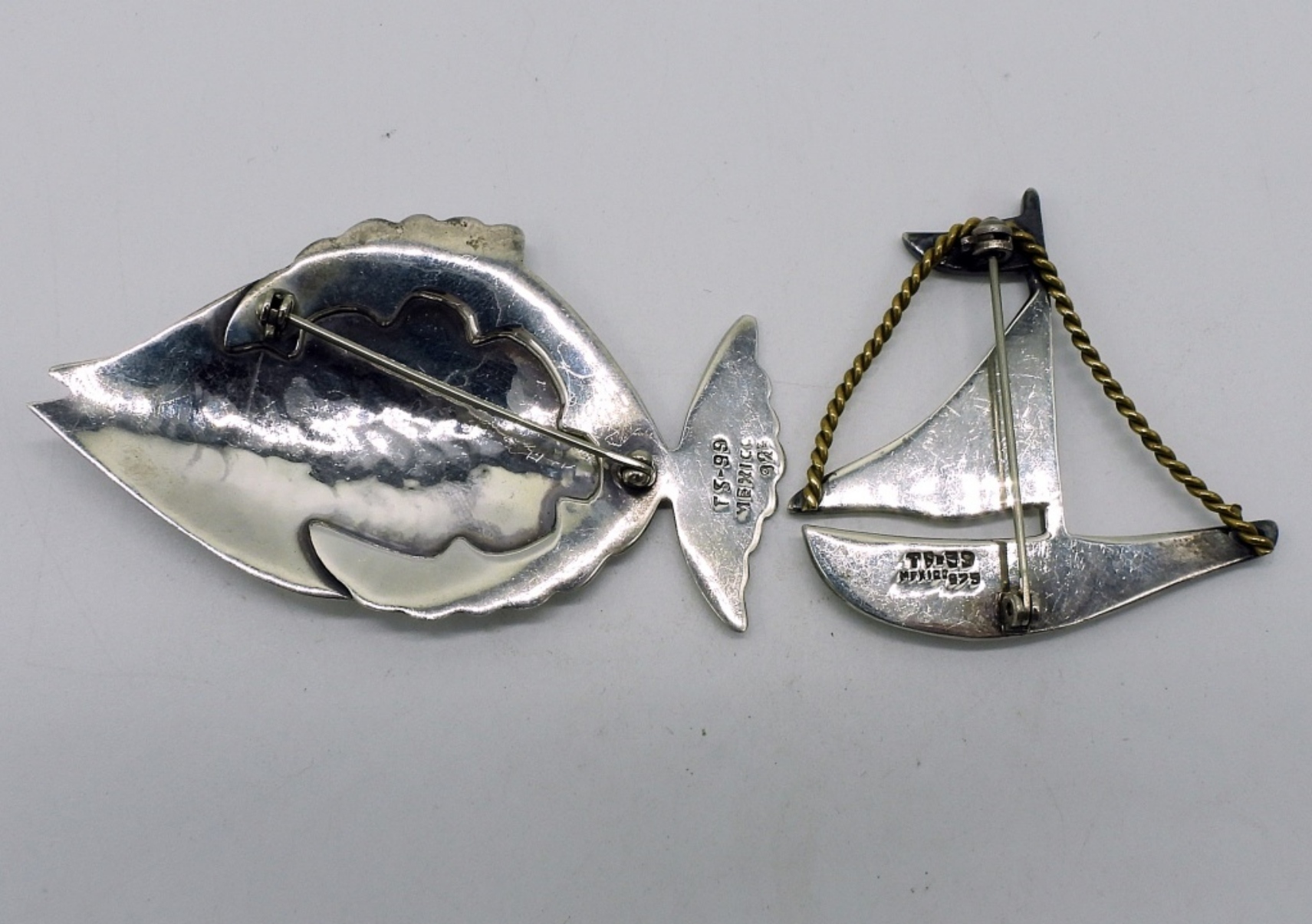 Two sterling Taxco Mexico brooches. Fish (Ts-99) is 3″ wide & 1.5″ long. Sailboat (T?-?9 – hard to read) is 2″ x 2″. (19.9 dwt) (6x4x2)
