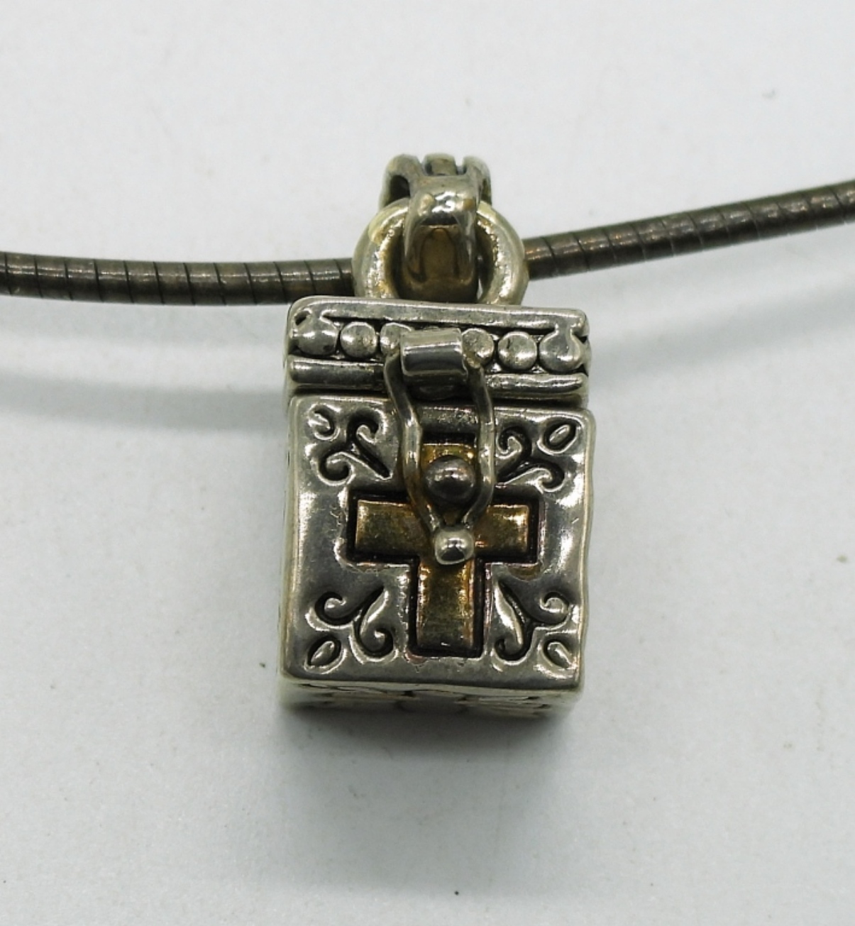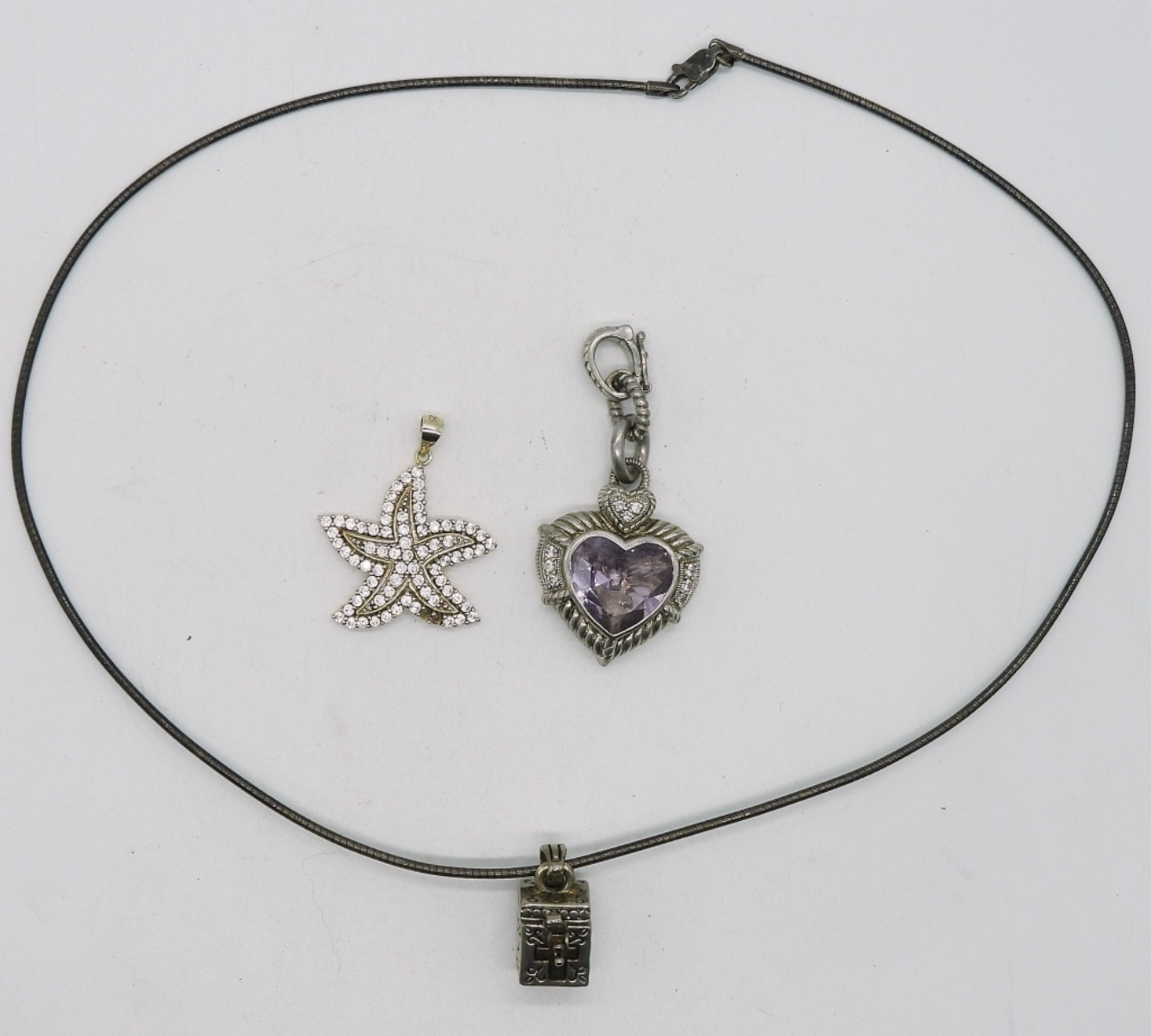 Three sterling pendants, 1″ – 2″. Sterling chain, 18″. (22.7 dwt)