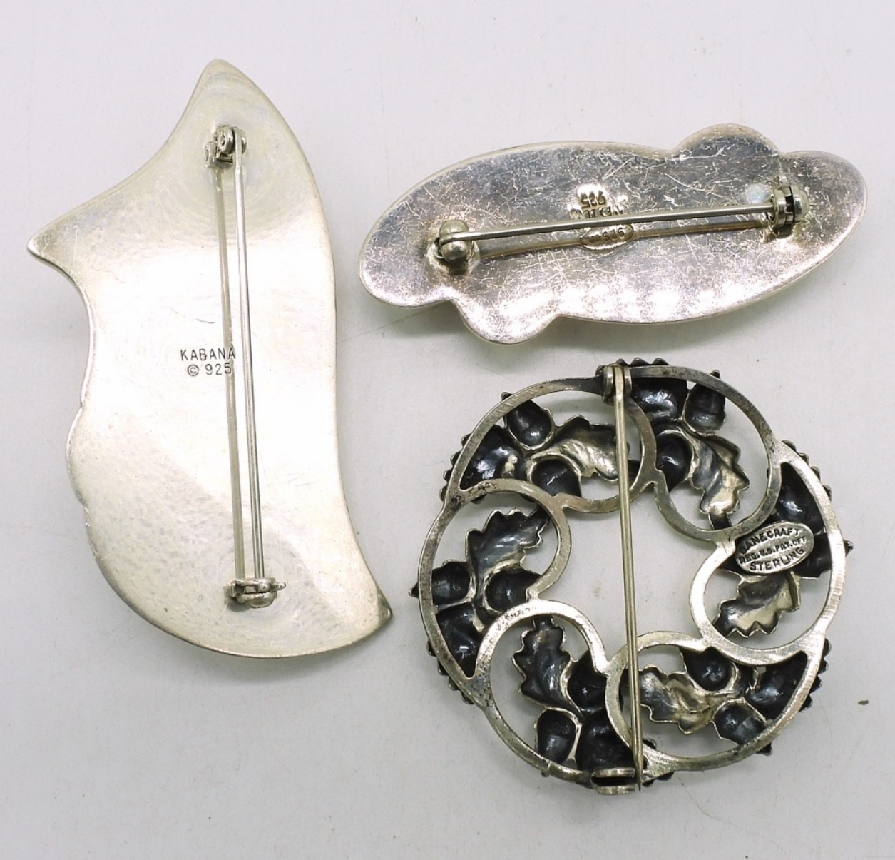Three sterling vintage brooches. 1.5 – 2.5 inches. (21.7 dwt)