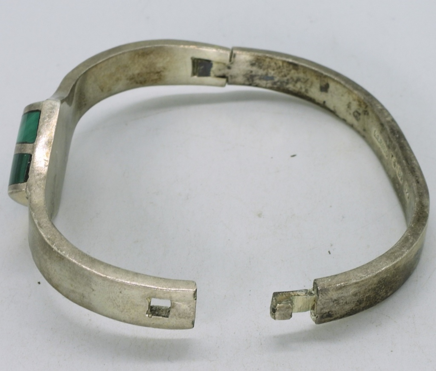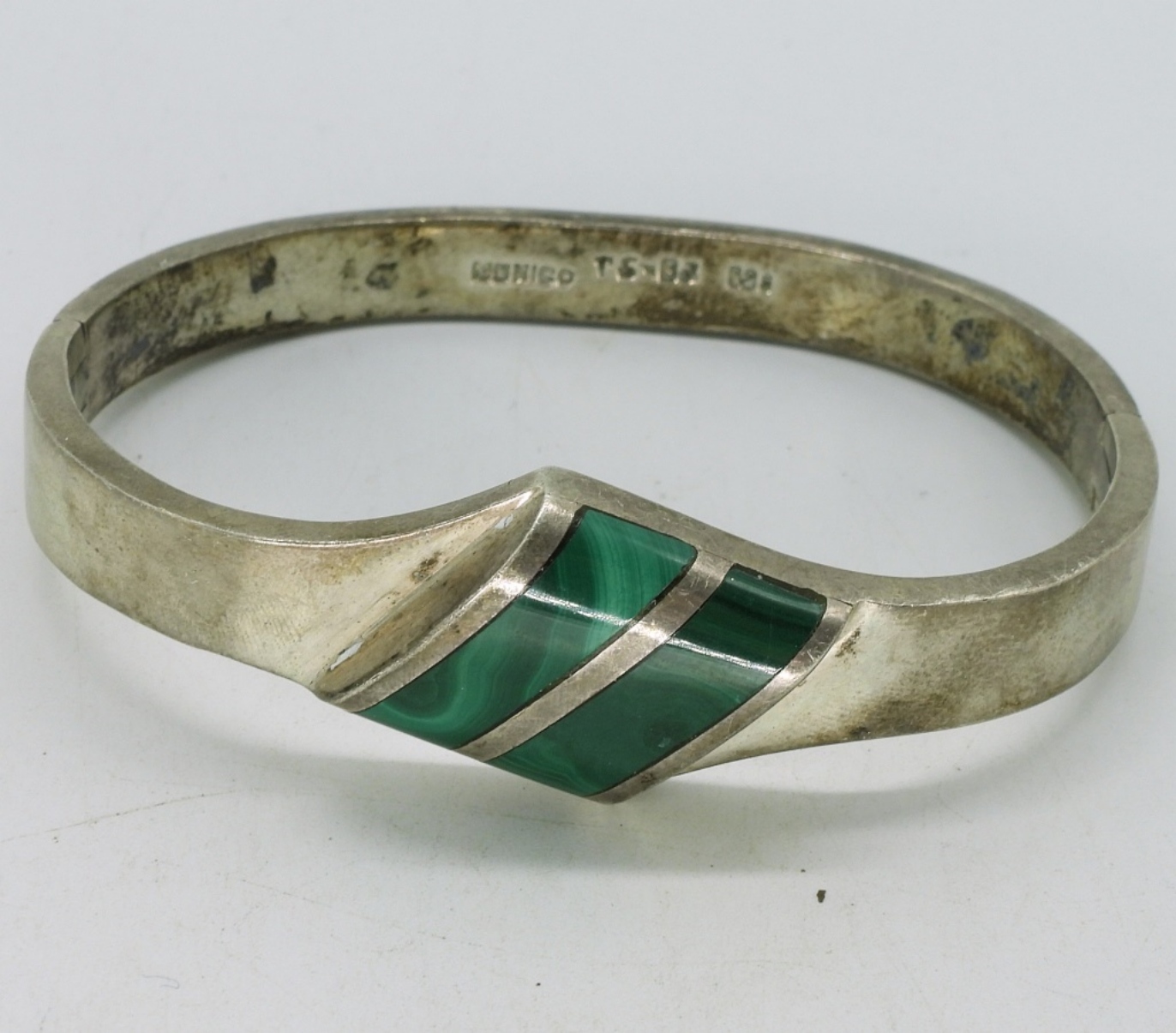 Vintage Taxco, Sterling Malachite hinged bracelet. “TS-83”. (30 dwt)