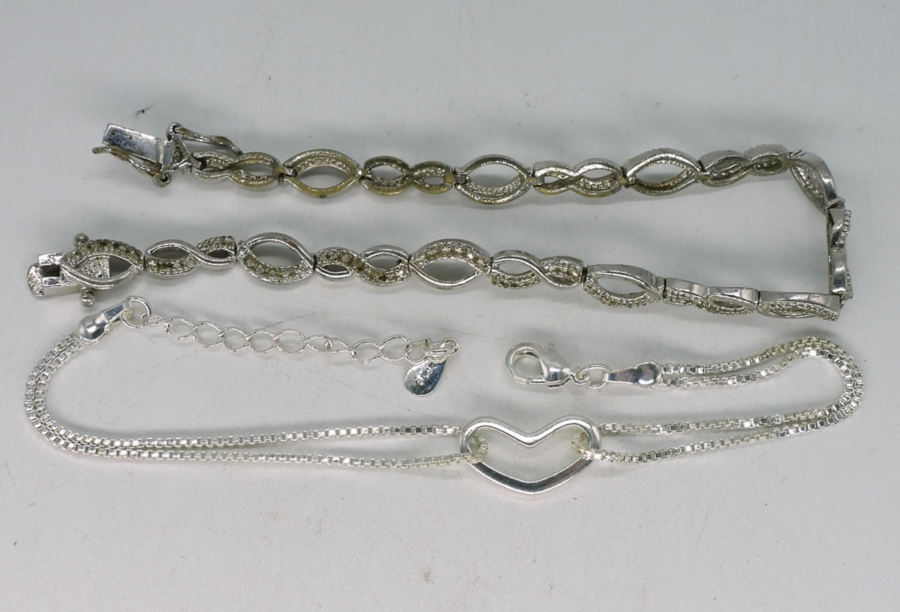 One sterling heart necklace with moissanite gemstones (tested), 18″ long. Two sterling bracelets, 7.5″. (11.4 dwt)