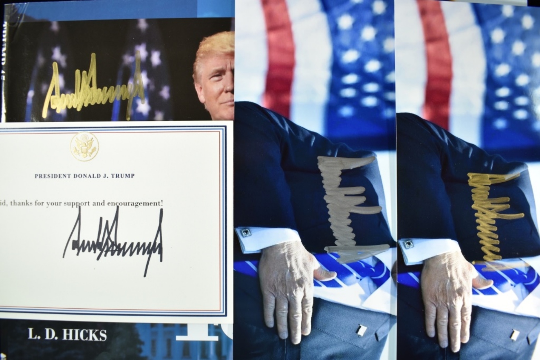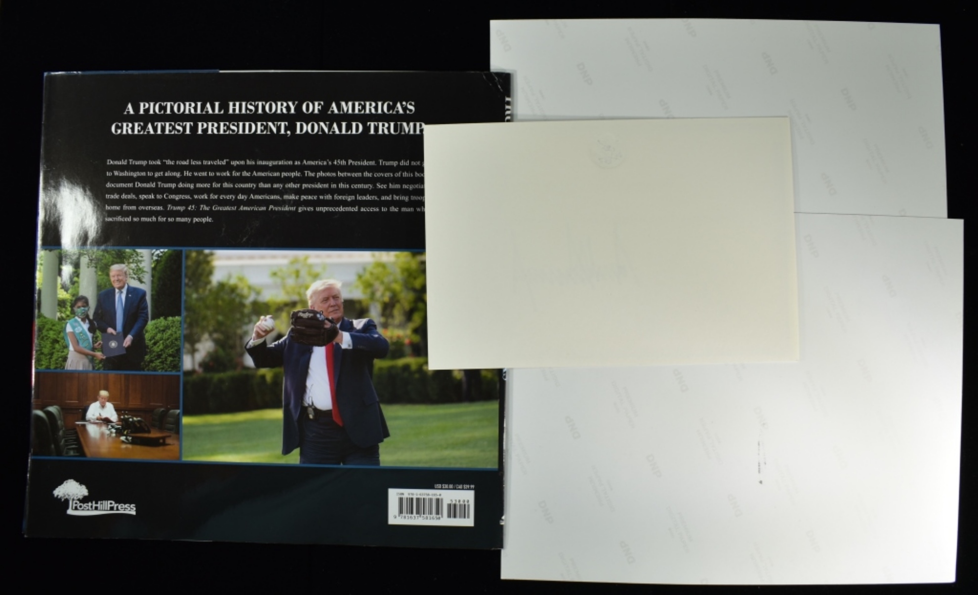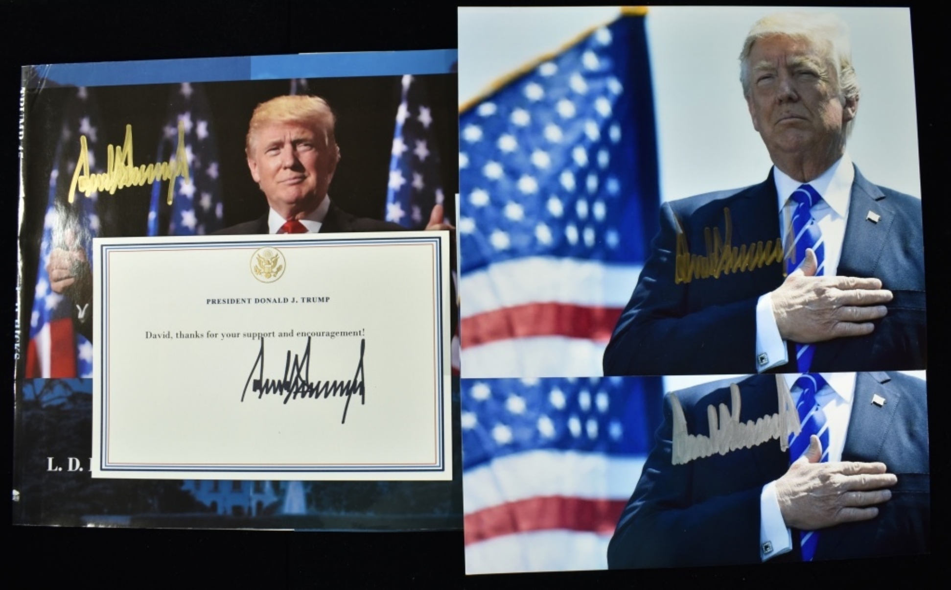 (1) A book cover (book not included). (2) 8X10s. (1) A note that reads “President Donald J. Trump, David, thanks for your support and encouragement!” Then it was signed