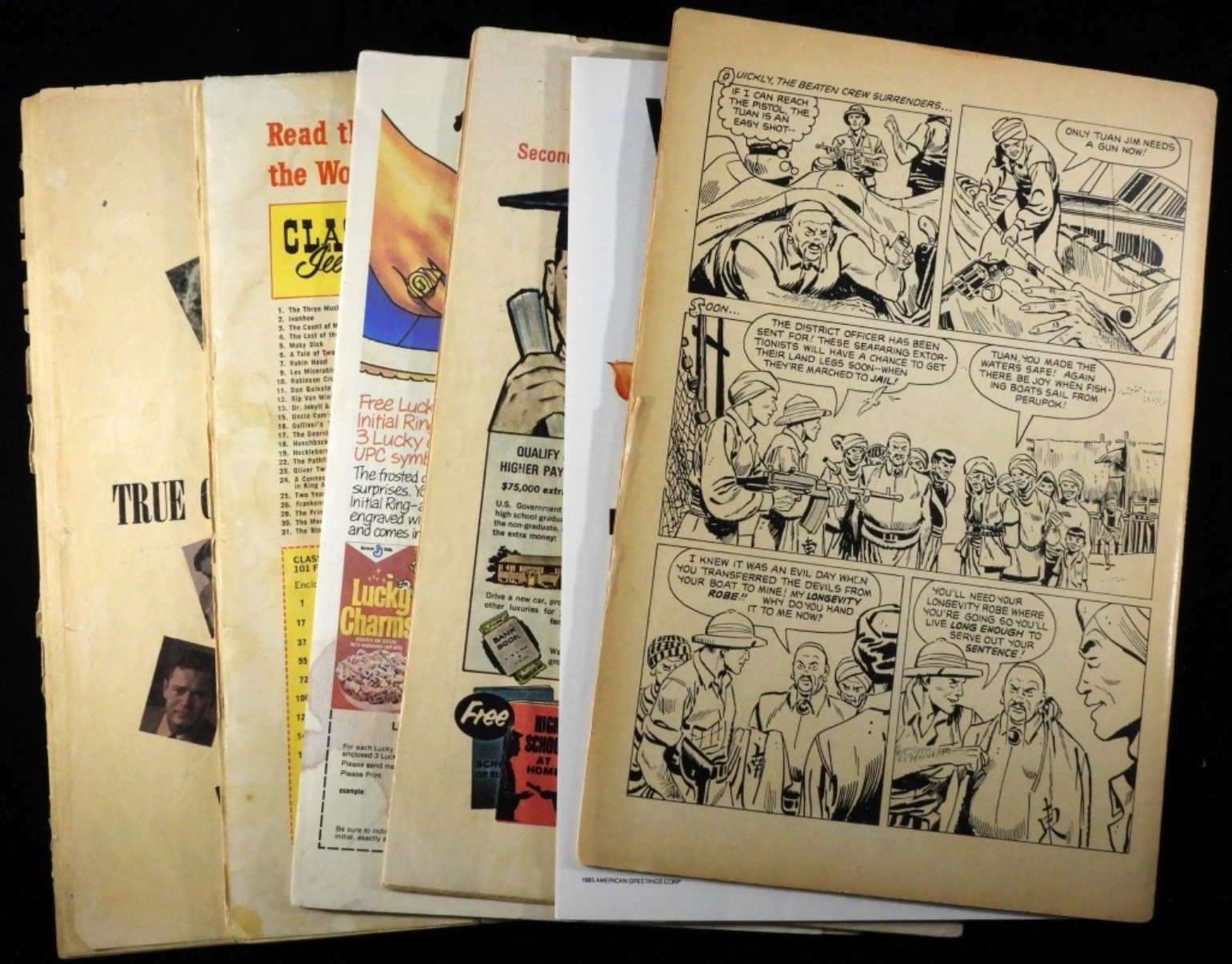 1) Thunder Cats #1, 1985. 2) Charlton Comics Sweethearts #115, 1971. 3) Star Comics Top Dog #1, 1985. 4) Classics Illustrated 20,000 Leagues Under The Sea. #47, 1948 (the cover is almost totally ripped off.) 5) Life Story