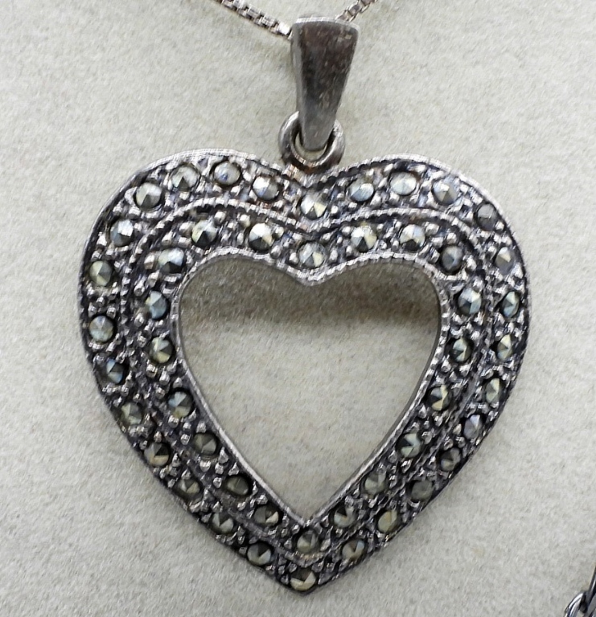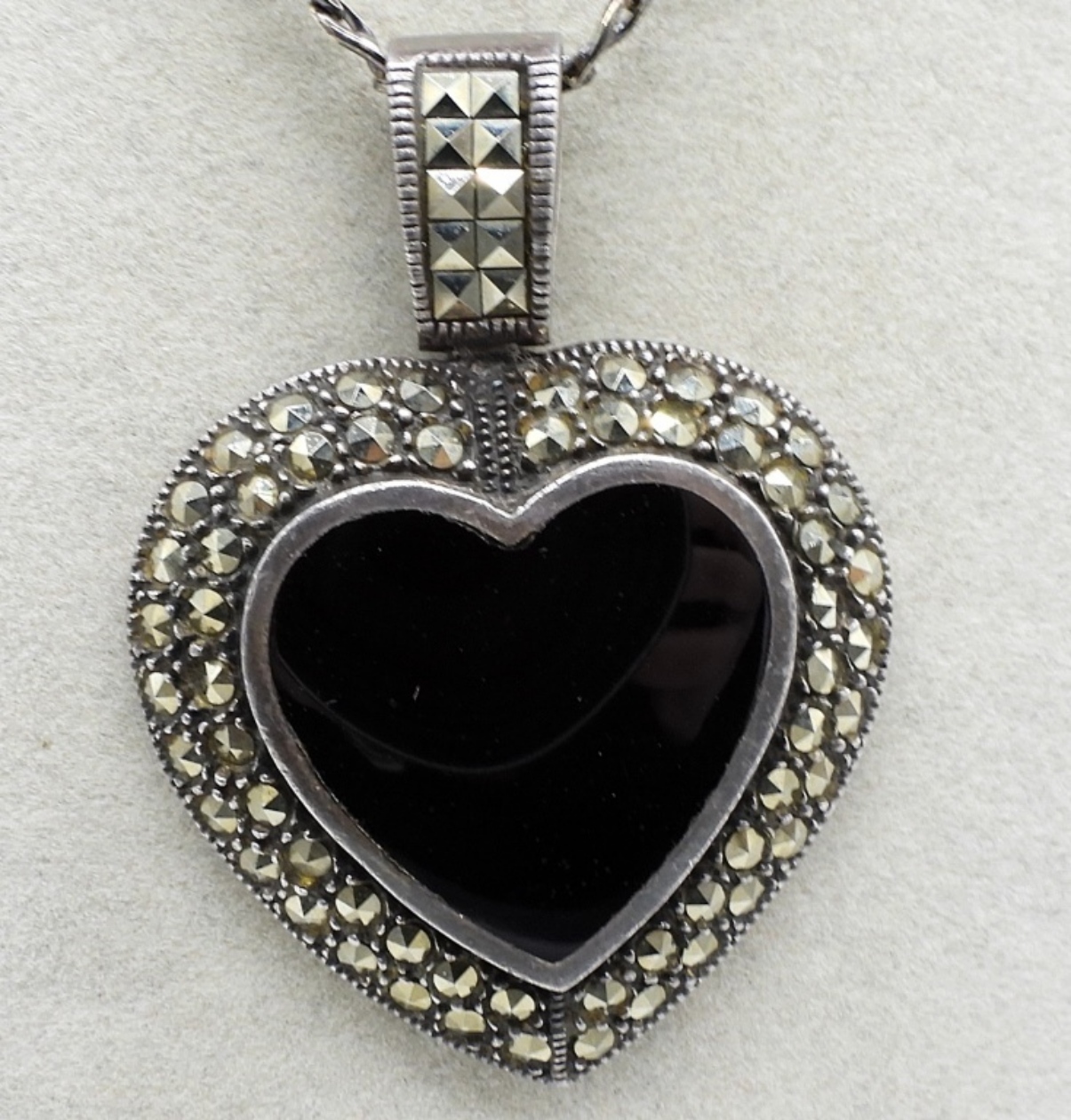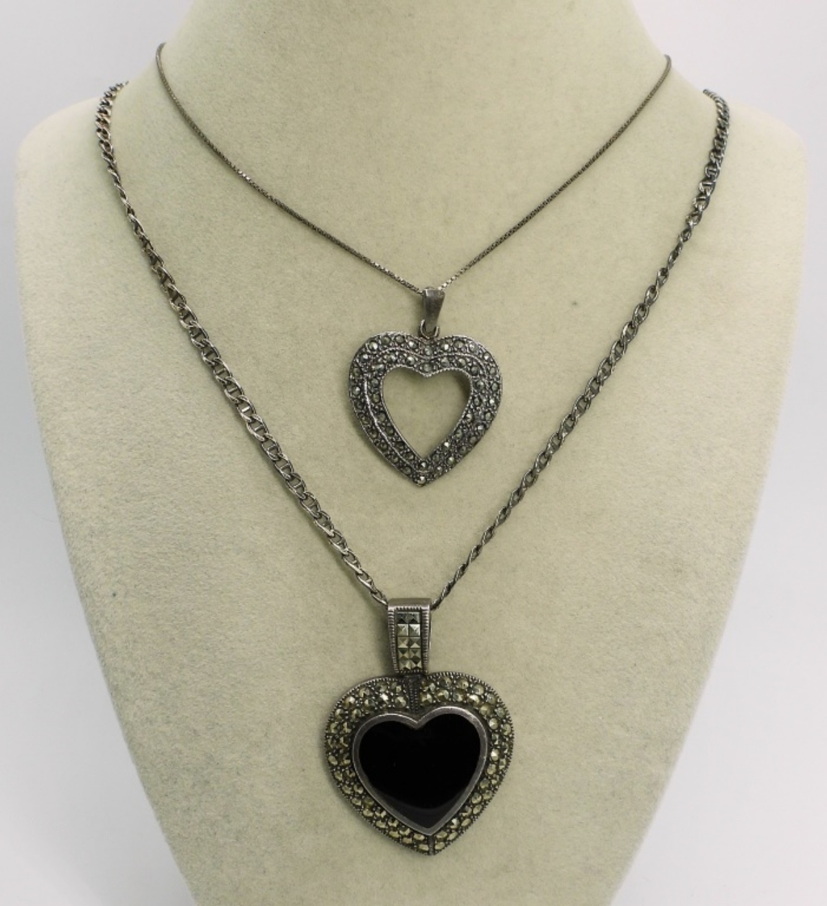 Two heart shaped sterling pendants on sterling chains. Black Onyx and Marcasite. 20″ & 30″ long chains. (20 dwt)