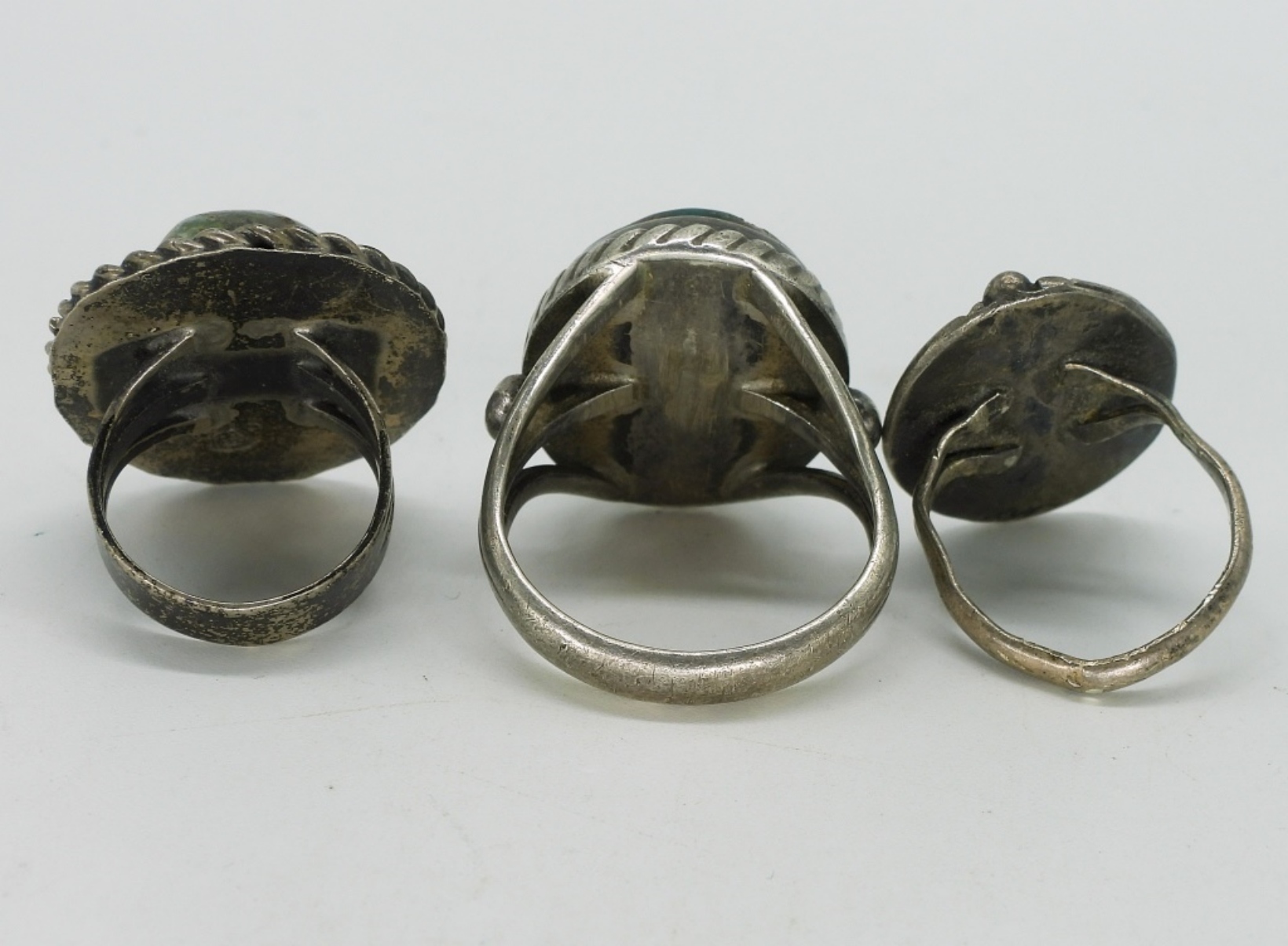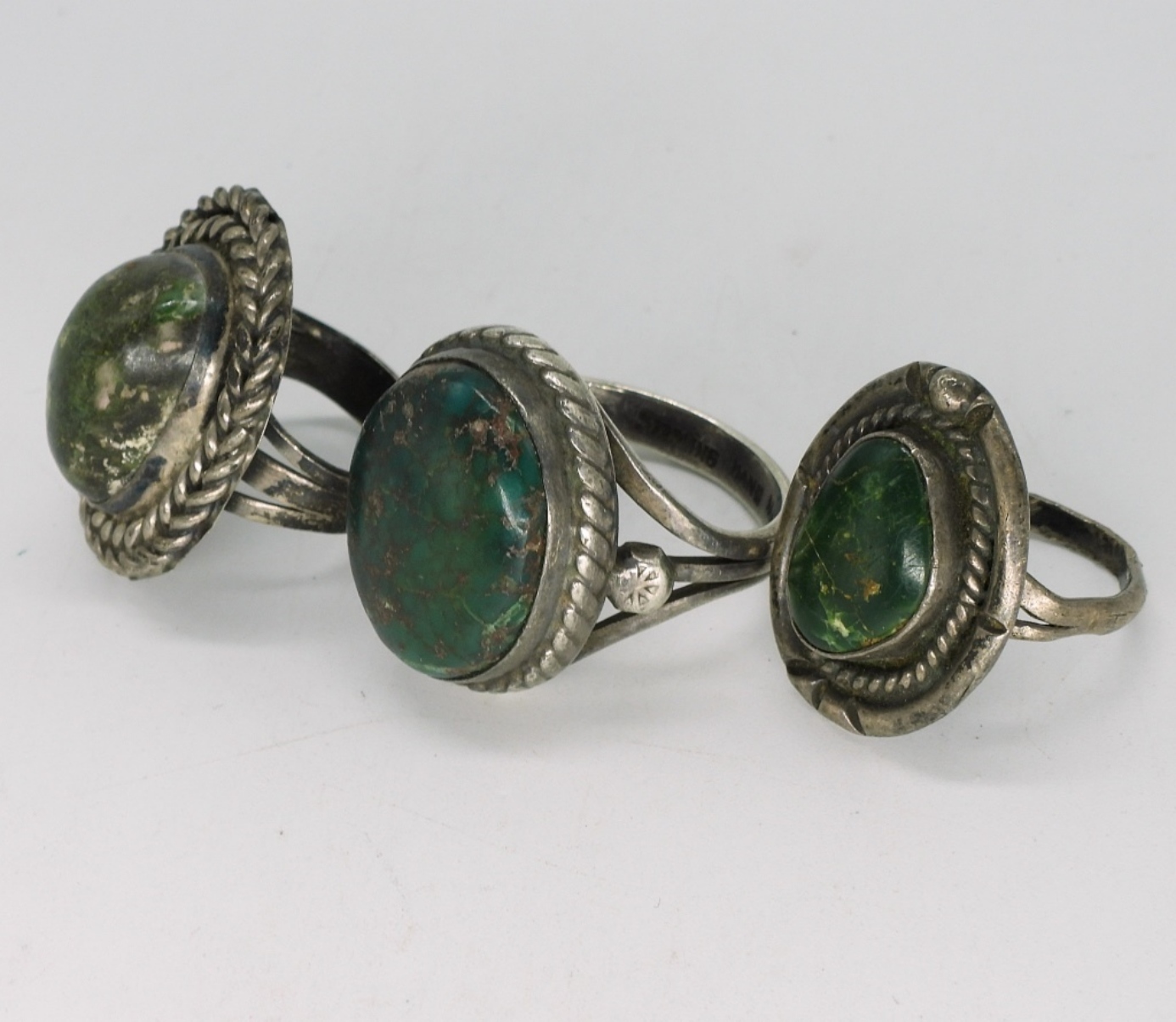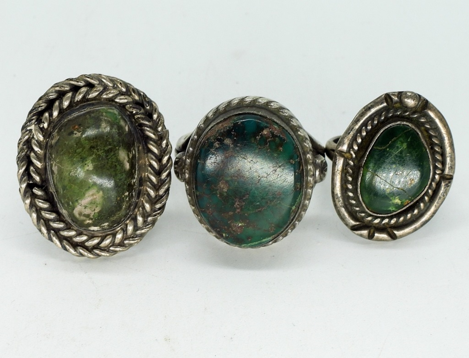 Three vintage sterling rings with green turquoise gemstones. Sizes 5, 6, 11 (17.3 dwt)