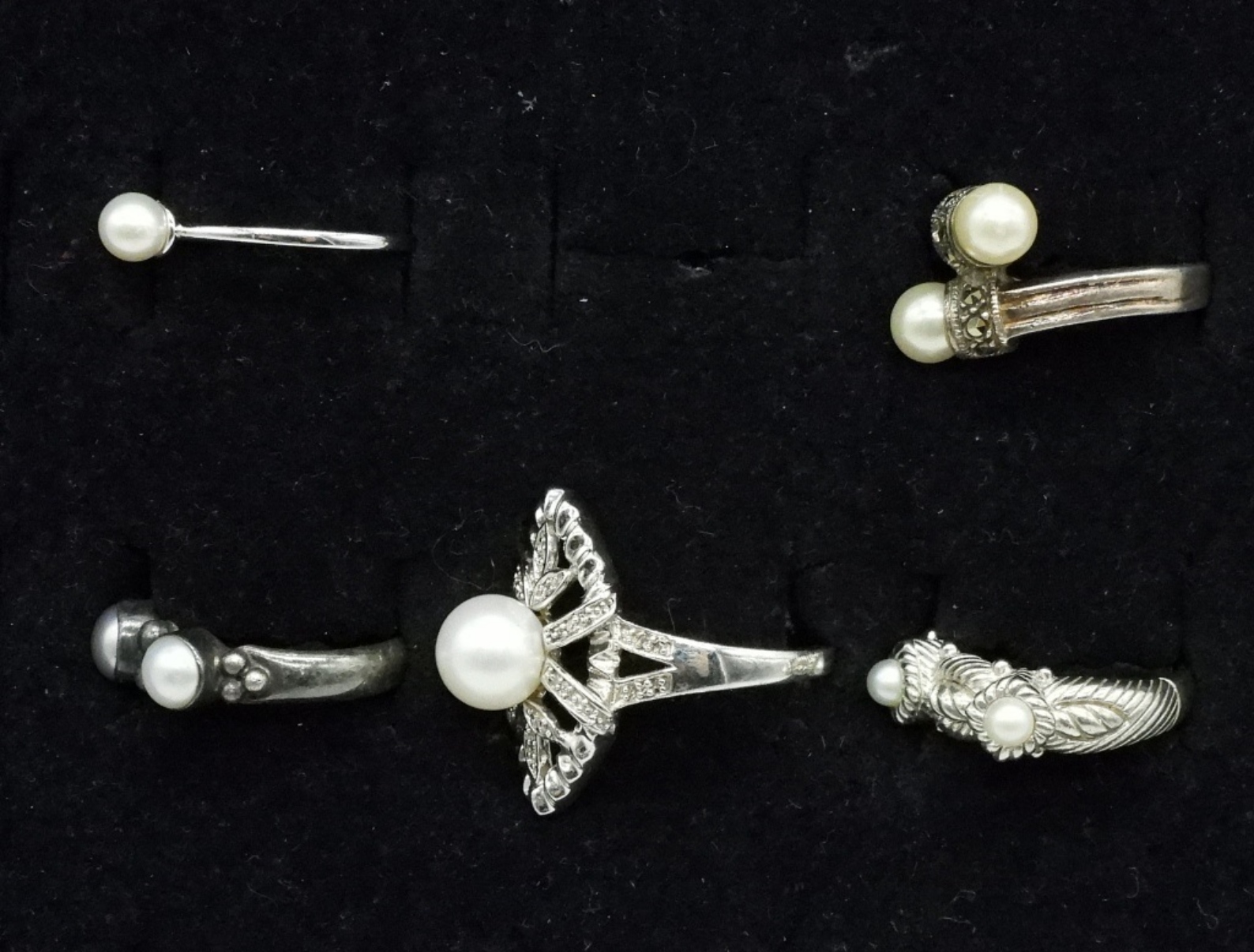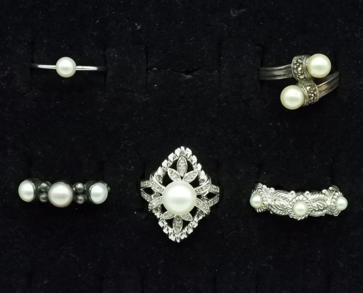 Five sterling pearl rings, sizes 7, 8, 9. (13 dwt)