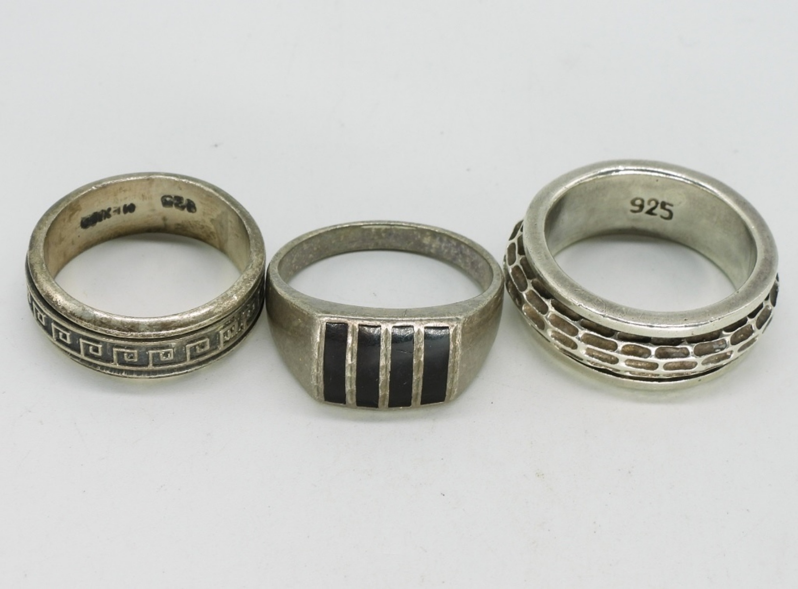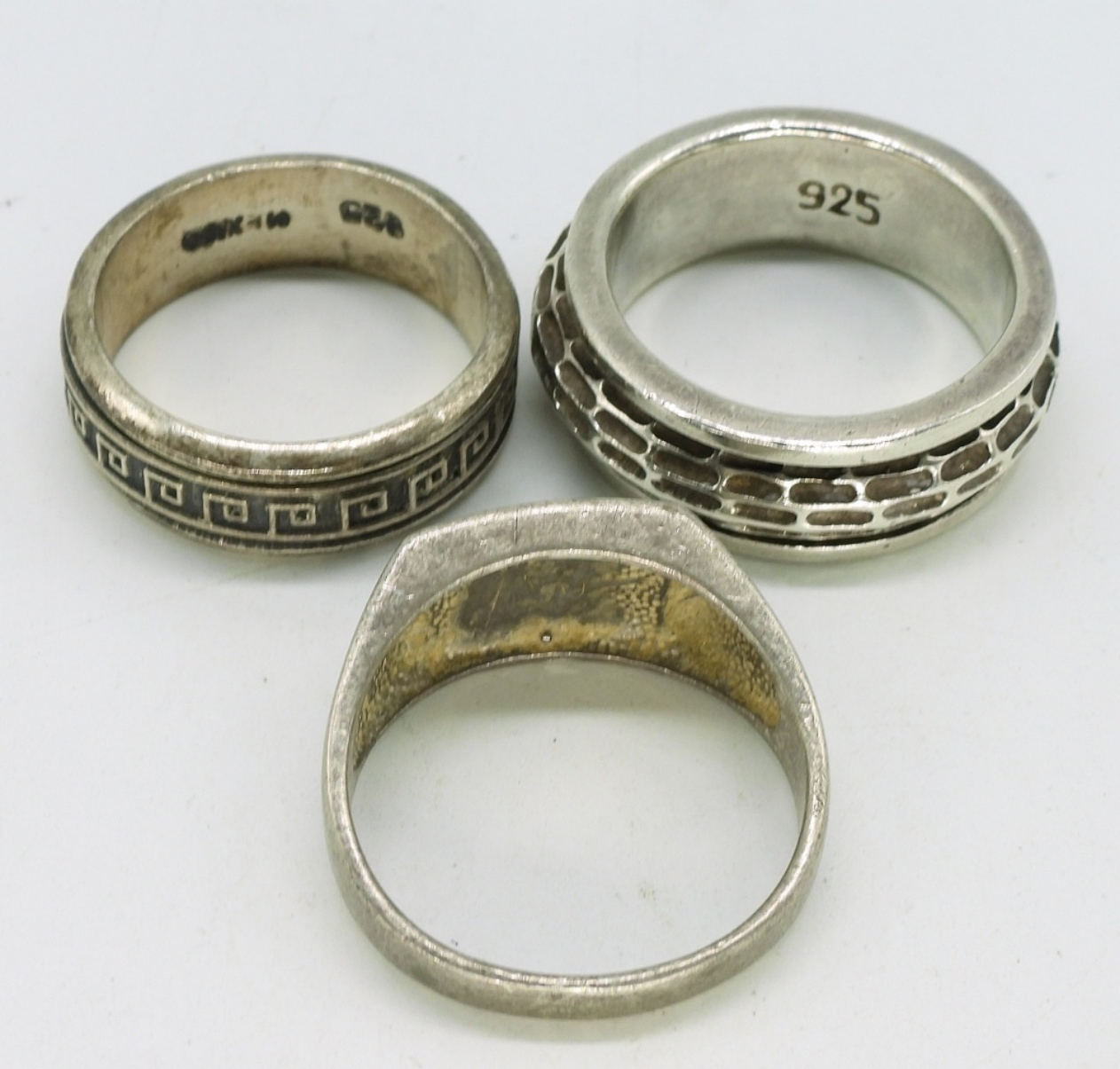 Three sterling mens rings, sizes 11.5 & 13. Two are fidget rings. (22 dwt)