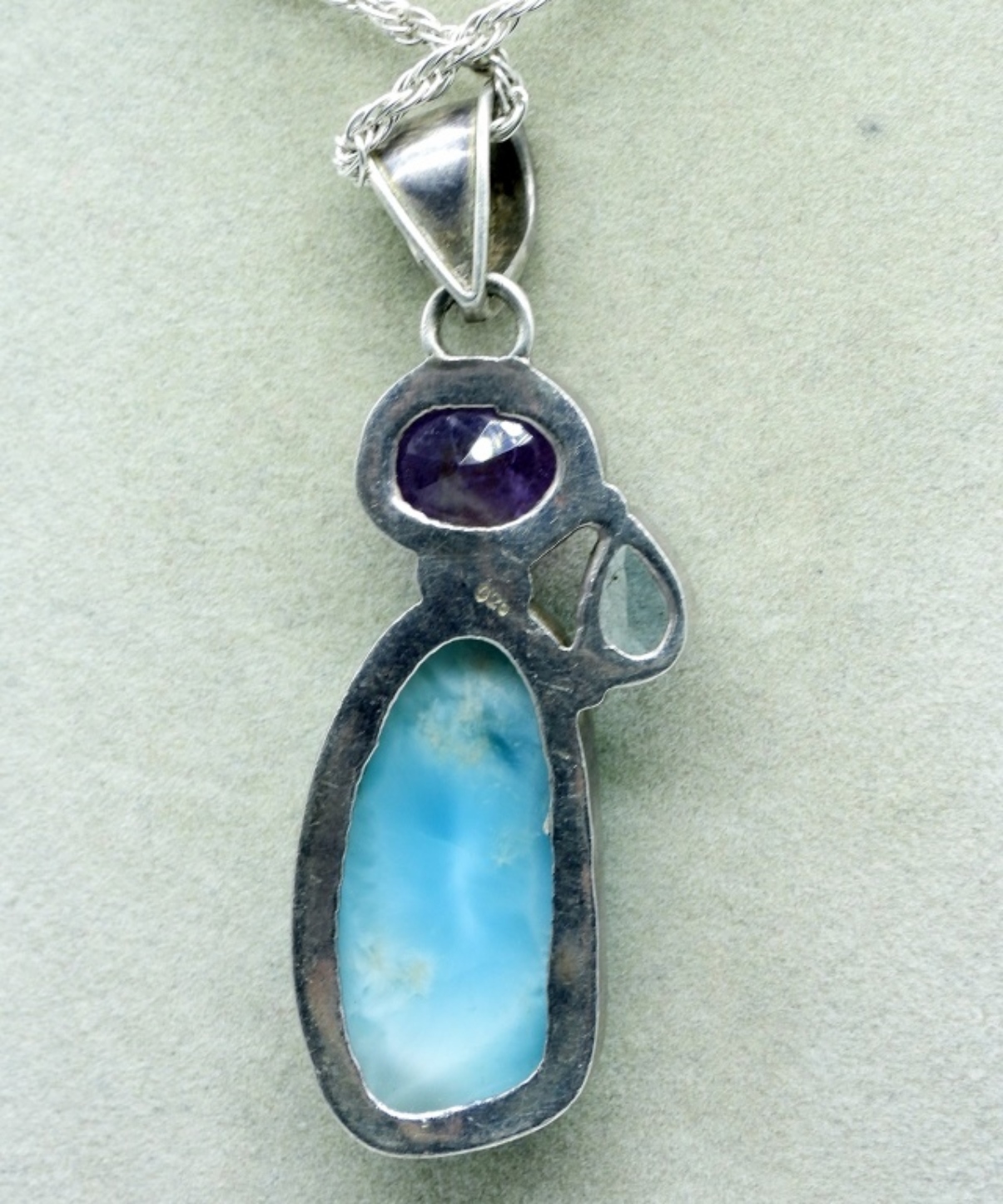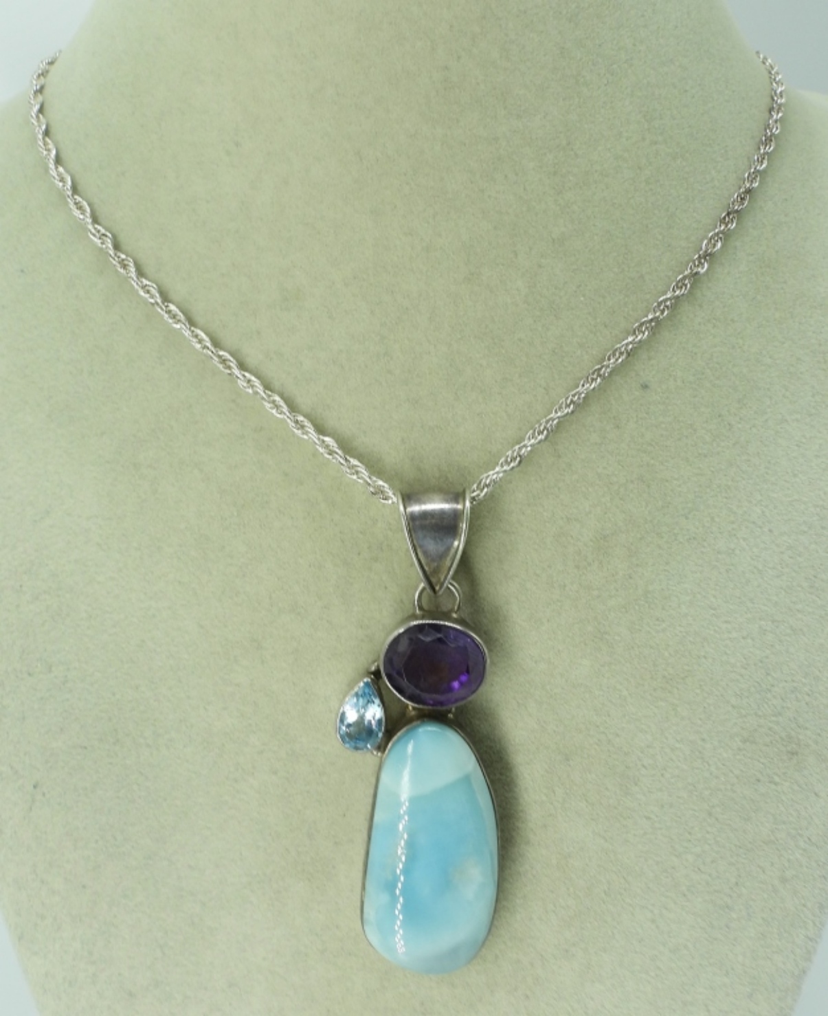 Sterling Larimar pendant with smaller amethyst and blue topaz gemstones. Pendant is 2.5″ long. Sterling chain is 30″ long. (11.8 dwt)