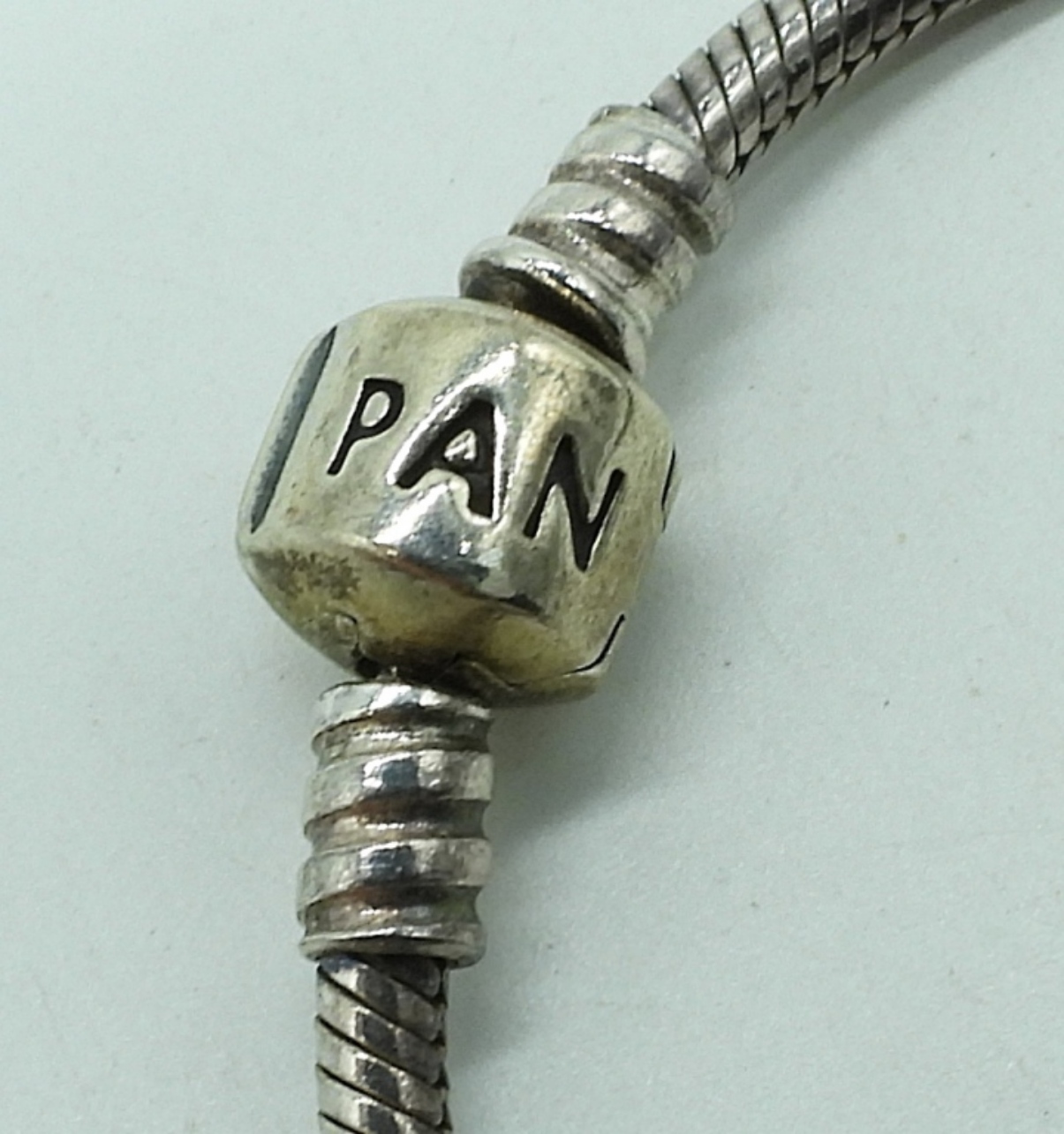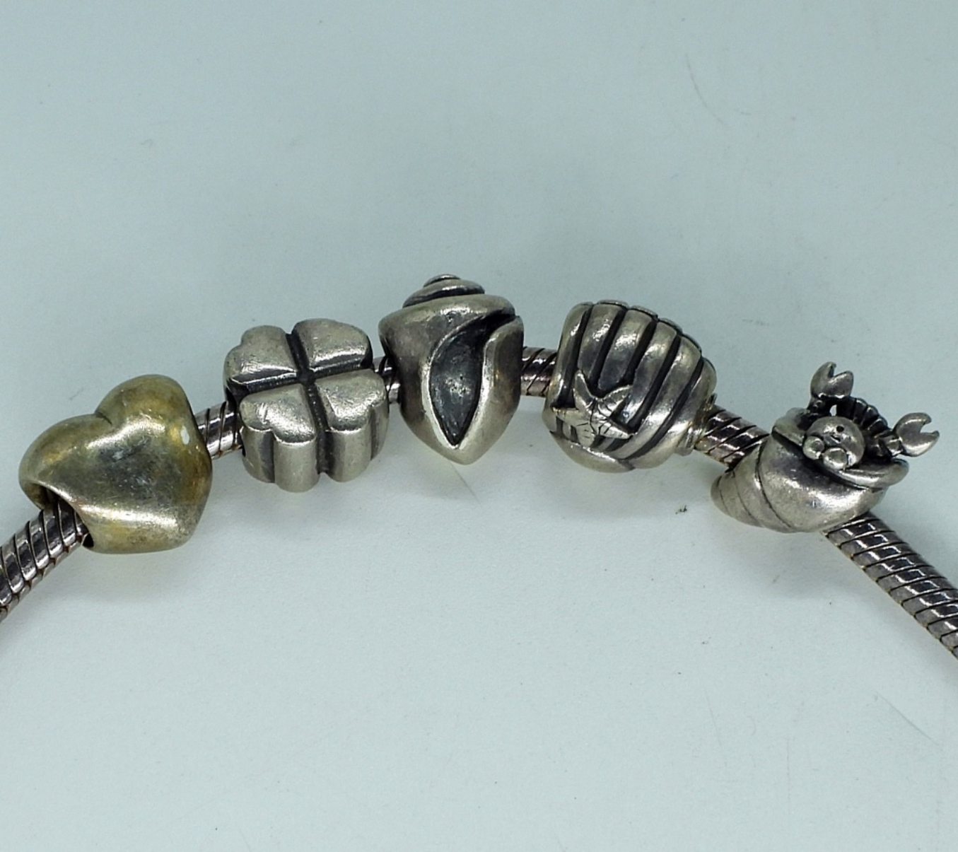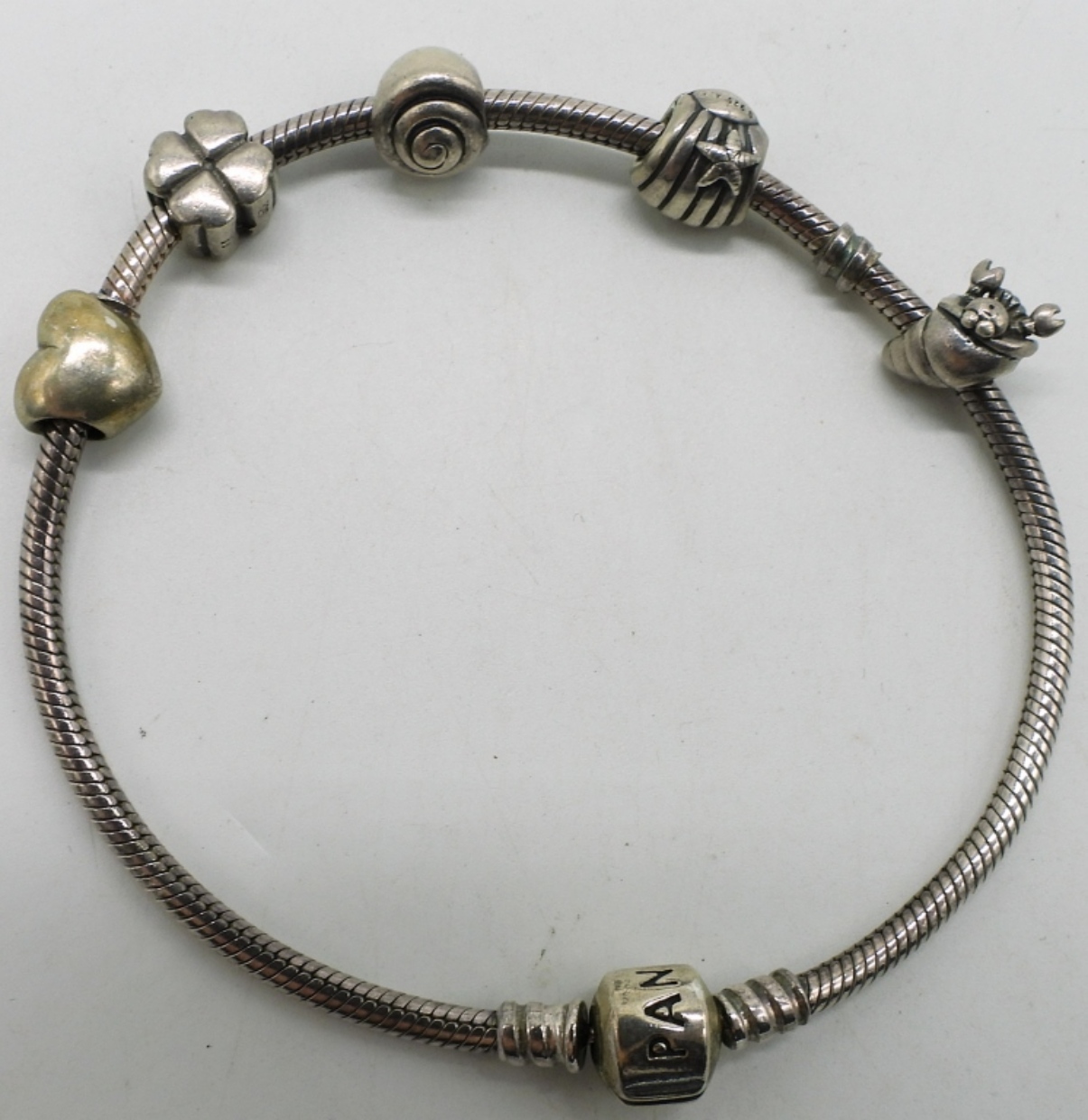 9″ long Pandora charm bracelet with 5 sterling charms. (20.5 dwt)
