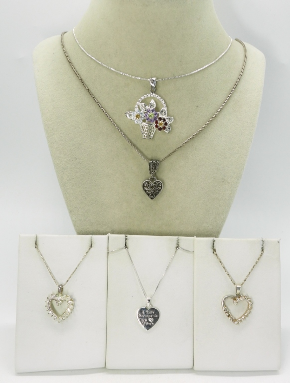 Five sterling necklaces. Heart shaped and flower basket. Sterling chains are 18″ – 30″. (23 dwt) (6x4x2)
