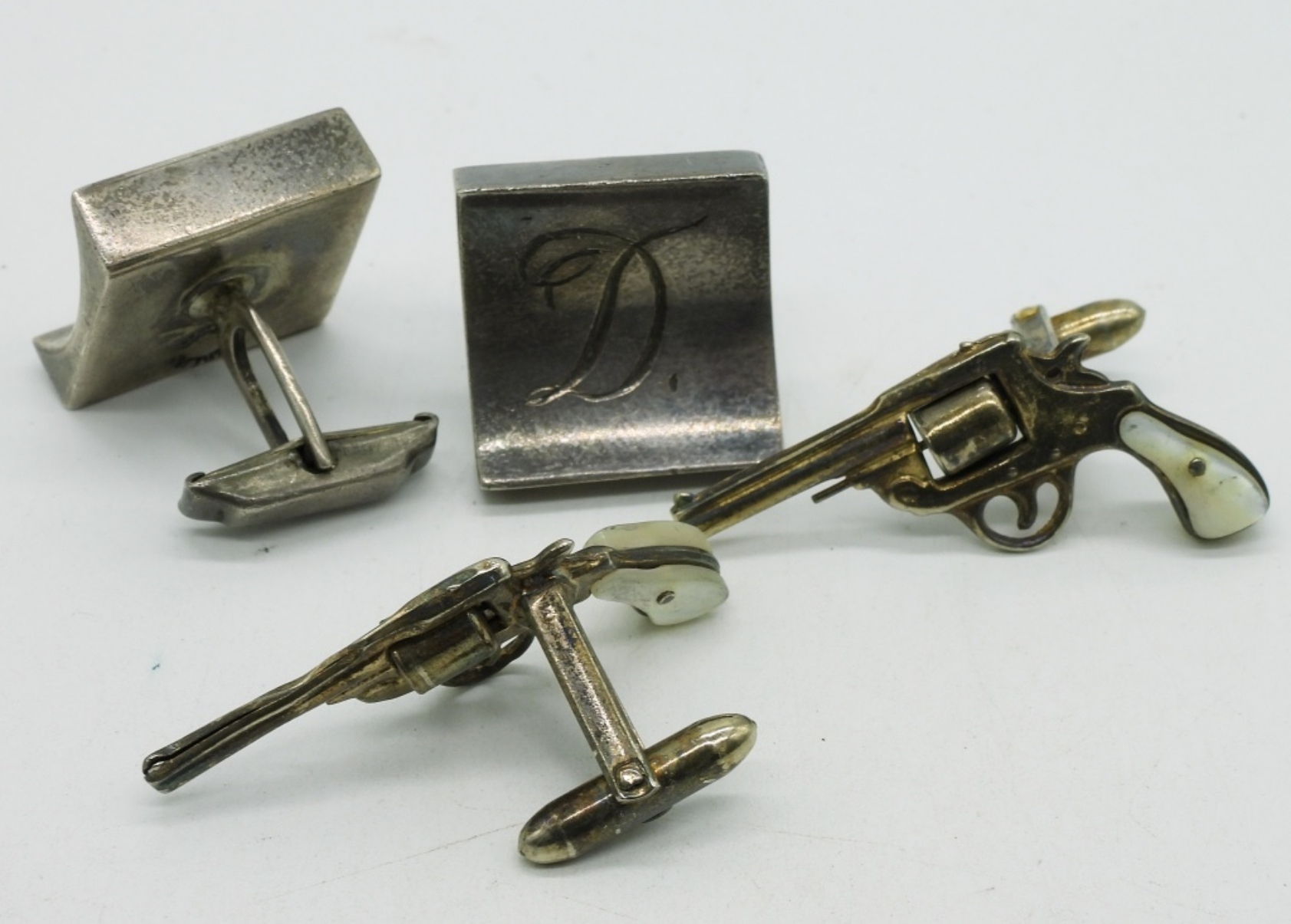 Two pair of vintage sterling cuff links. Pistols are 2″ wide. “D” square cufflinks are 1″. (20.4 dwt) (6x4x2)