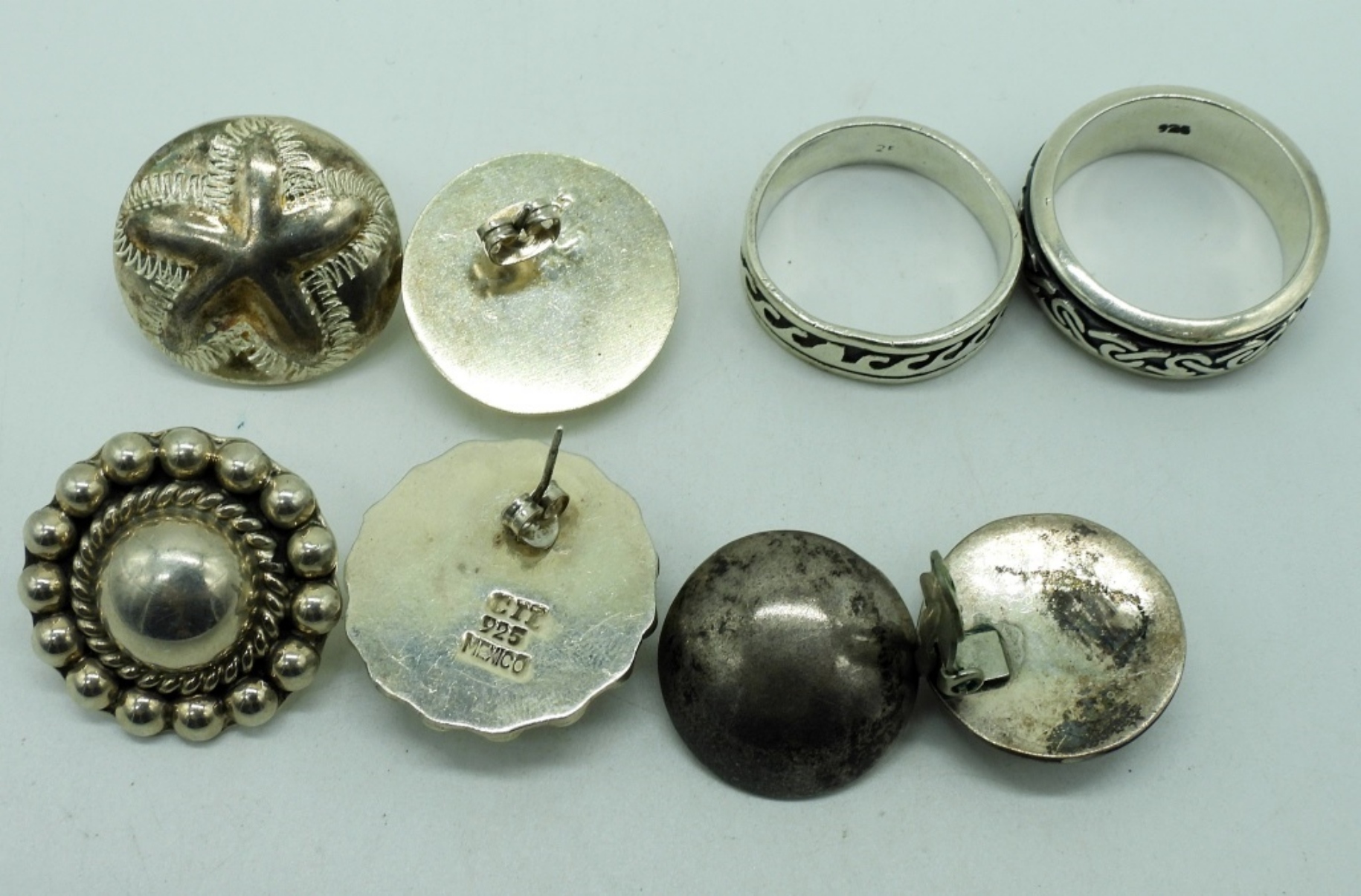 Three pair of sterling earrings, pierced and clip on. Two sterling fashion ring bands, sizes 10 & 11. (28.8 dwt) (6x4x2)