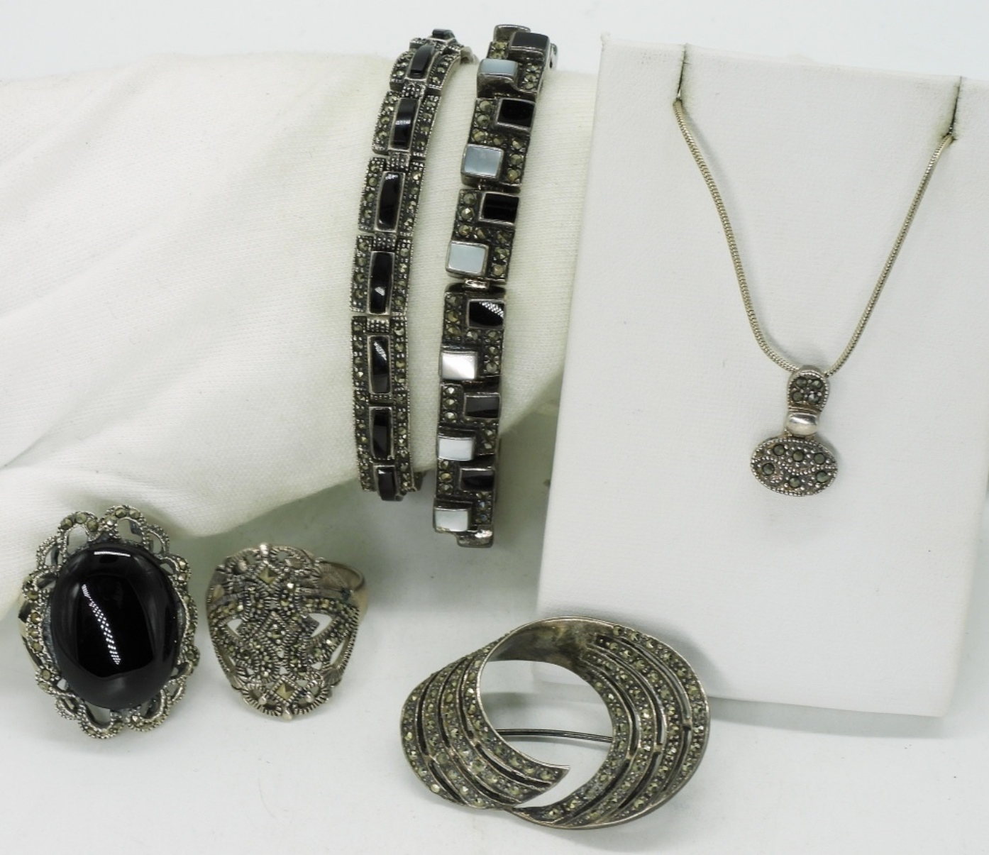 Sterling marcasite, black onyx & mother of pearl pieces. Bracelets are 7″ long. Necklace is 16″ long. Two sterling rings, sizes 9 & 11. Brooch is 2″ x 1″. (48 dwt) (6x4x2)